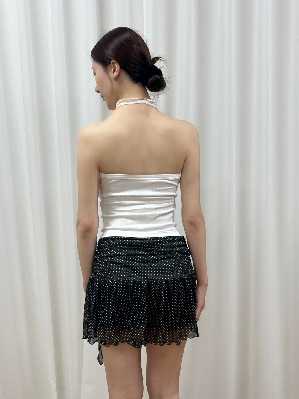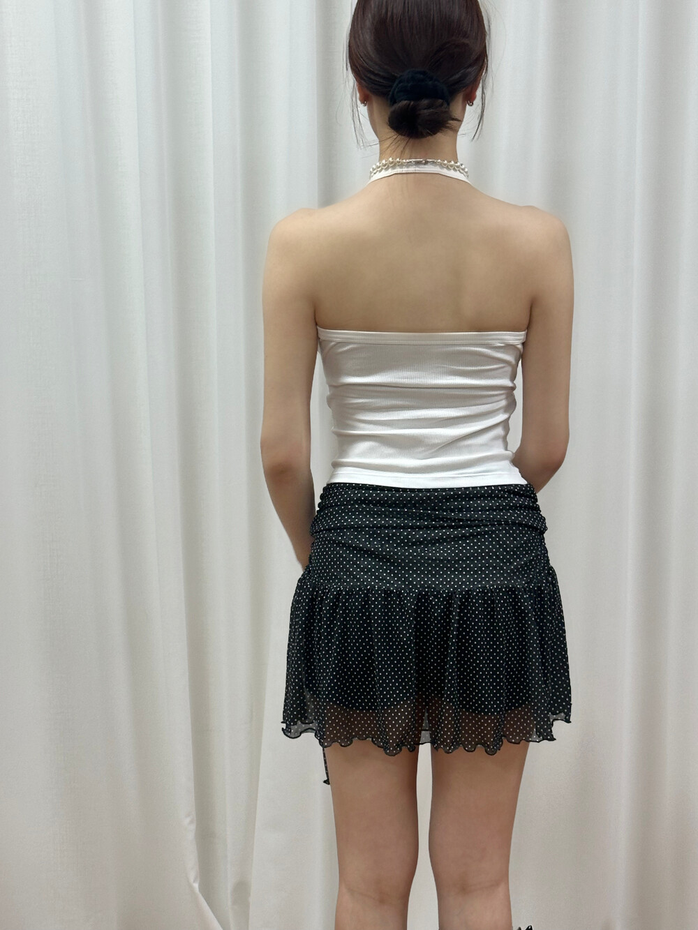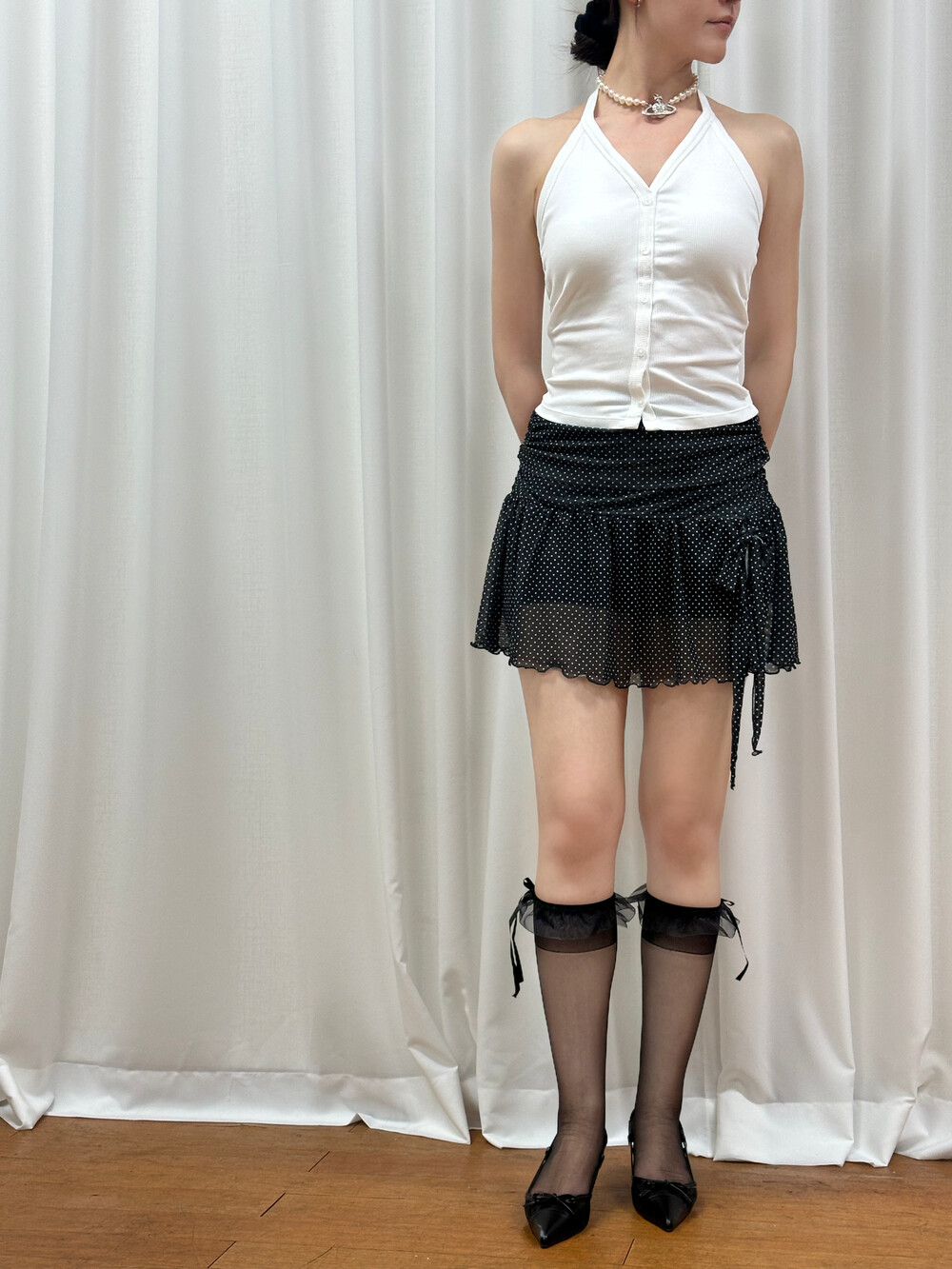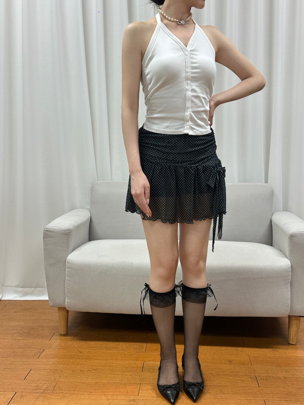 잔잔한 도트 패턴과 리본 스트랩이 사랑스럽게 어우러진 스커트예요.