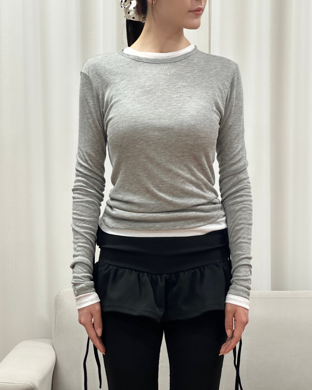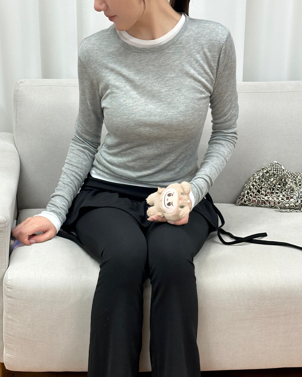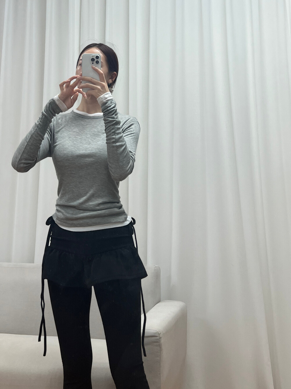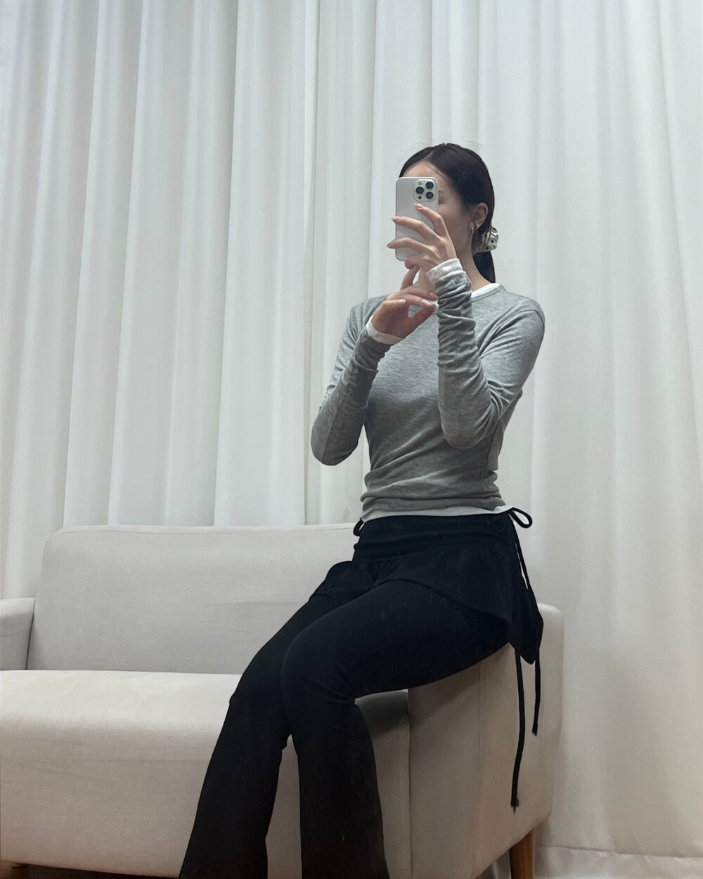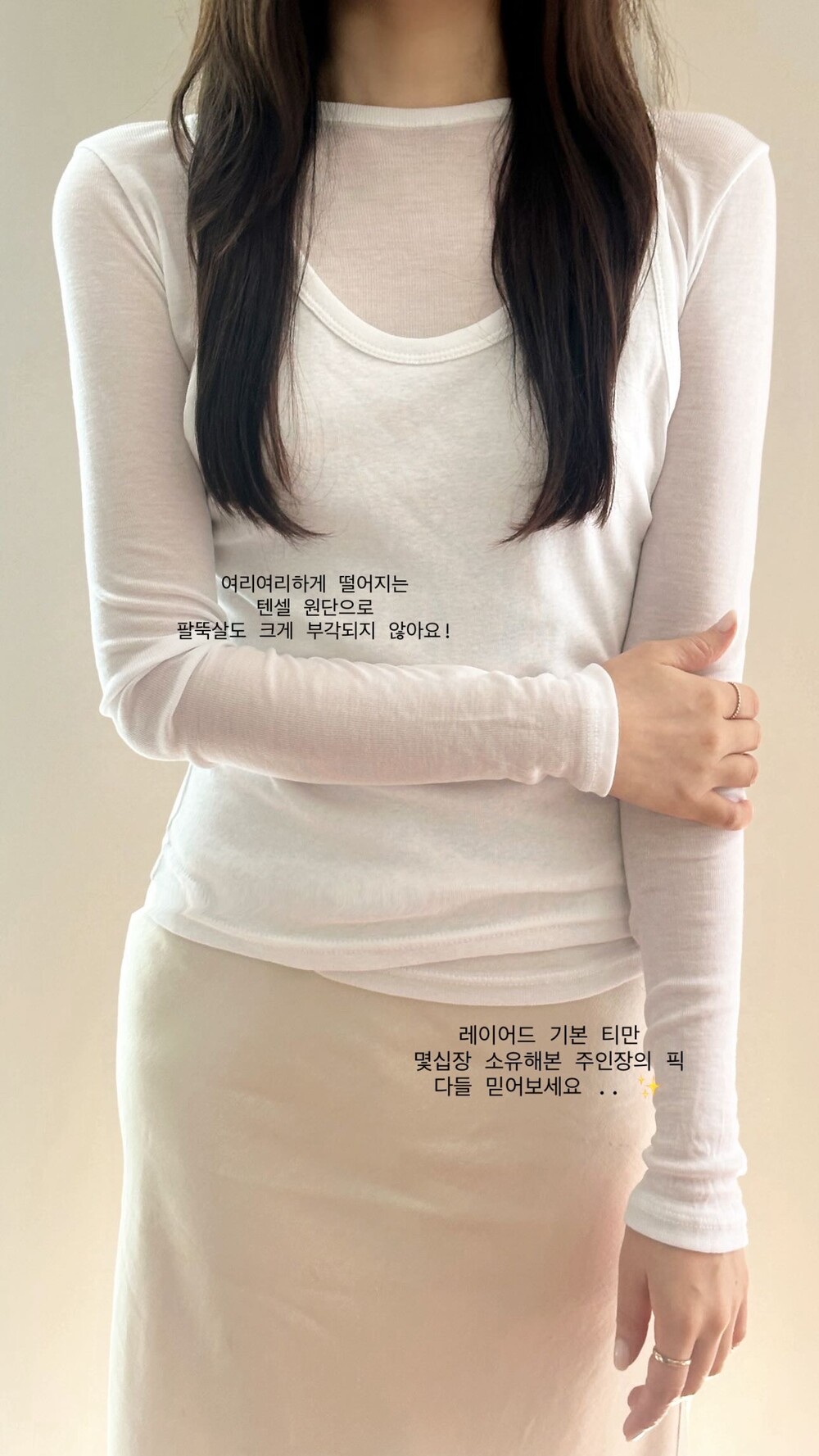 소매가 길게 떨어져 손등을 덮어주는 디자인으로 여리여리한 무드를 연출해주는 베이직 레이어드 티셔츠예요.