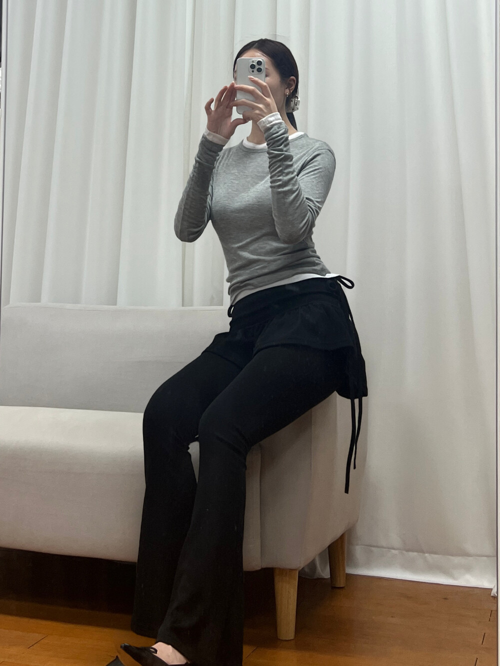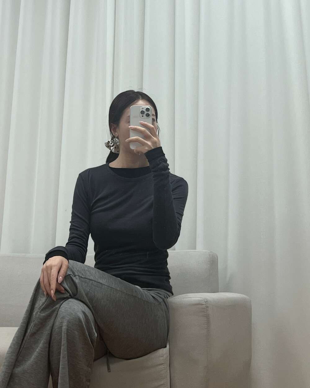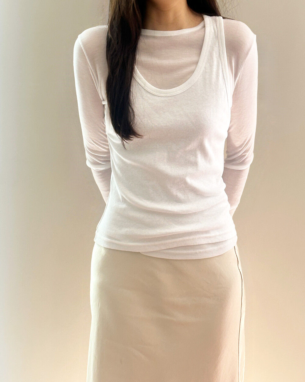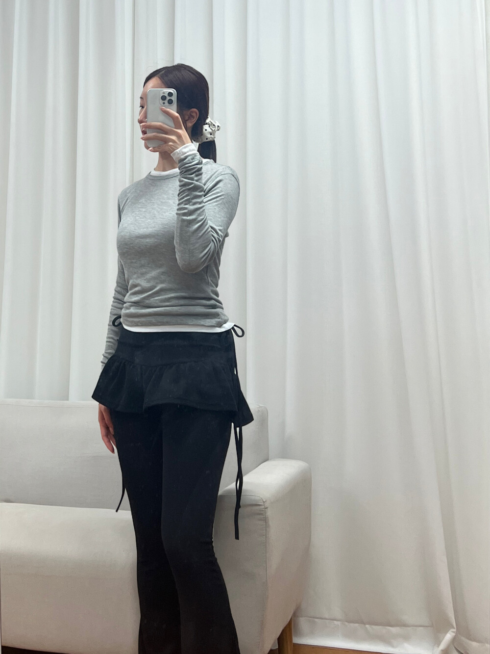소매가 길게 떨어져 손등을 덮어주는 디자인으로 여리여리한 무드를 연출해주는 베이직 레이어드 티셔츠예요.