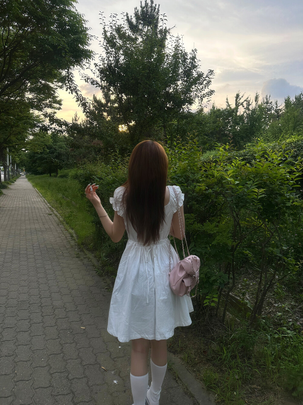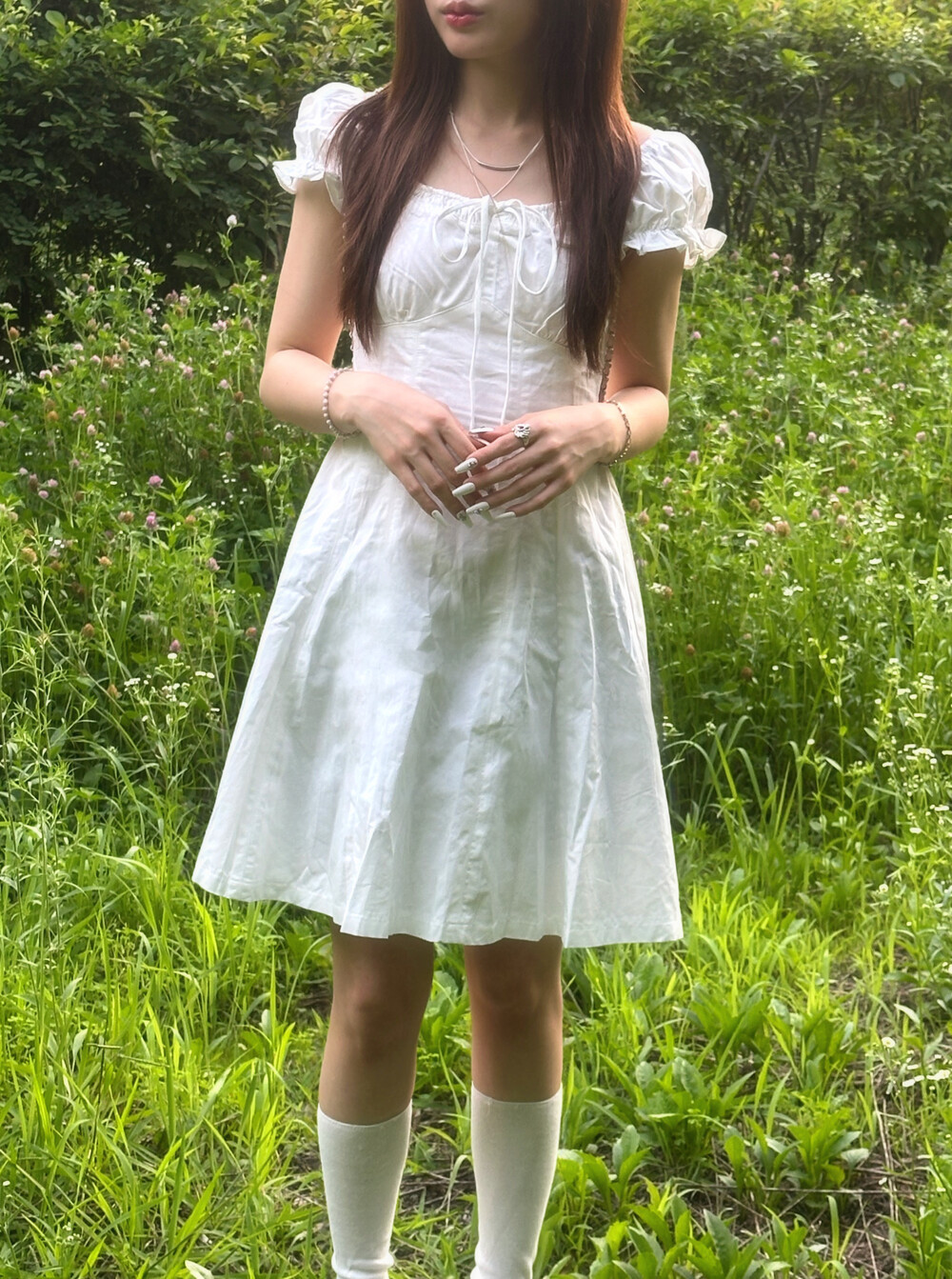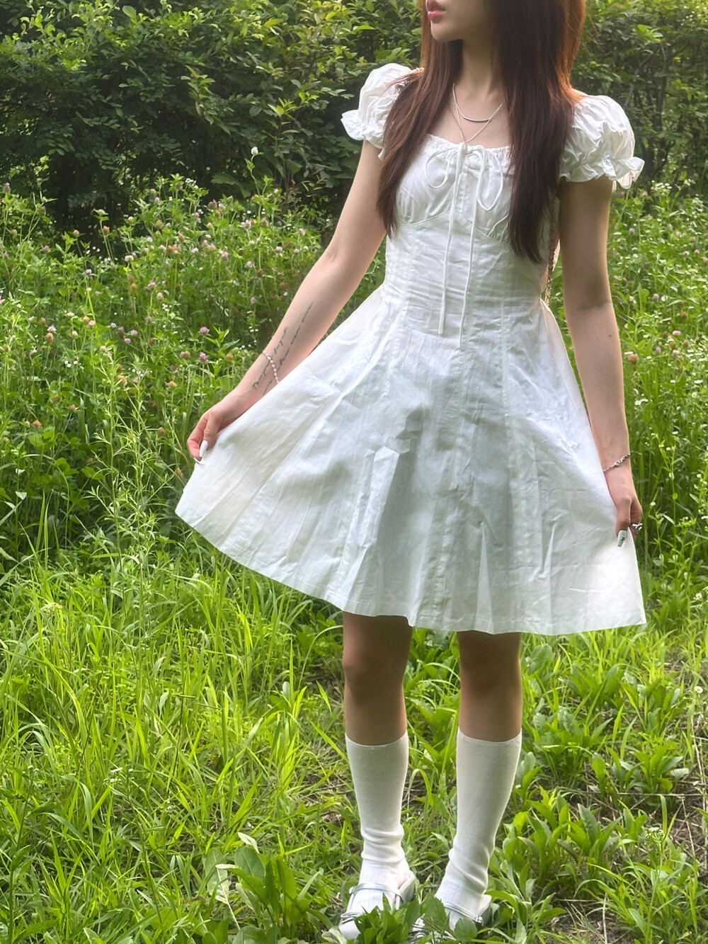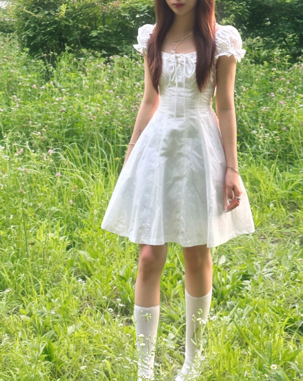 디테일과 풍성한 실루엣이 어우러져 청순하면서도 사랑스러운 무드를 연출해주는 발레코어 원피스예요.