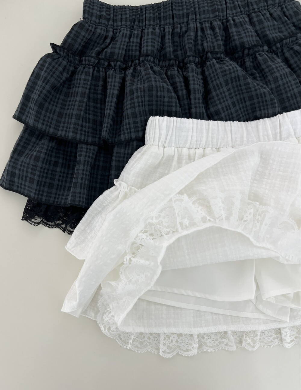 잔잔한 체크 원단 위에 3단 캉캉 프릴을 더해 러블리한 실루엣을 완성해주며 밑단에는 섬세한 레이스가 더해져 한층 더 로맨틱하고 키치한 포인트를 더했어요.