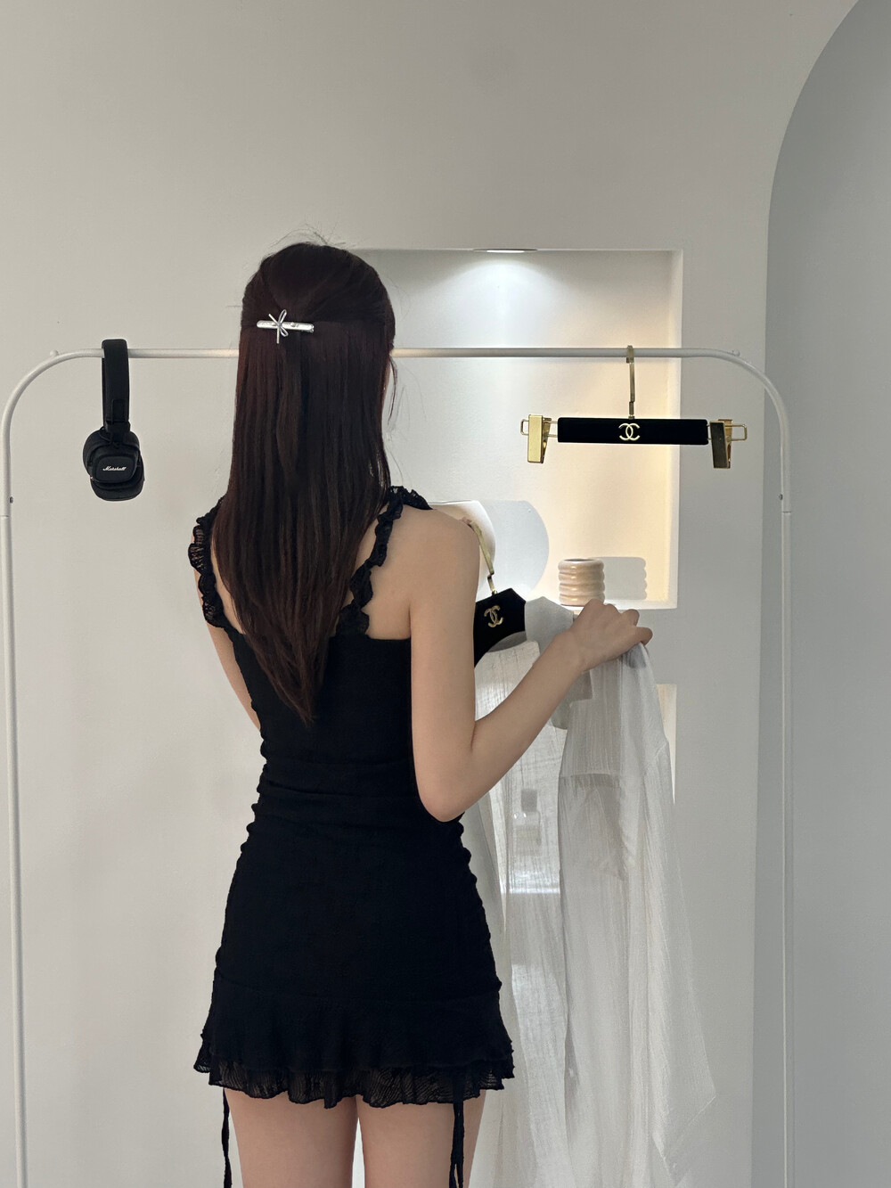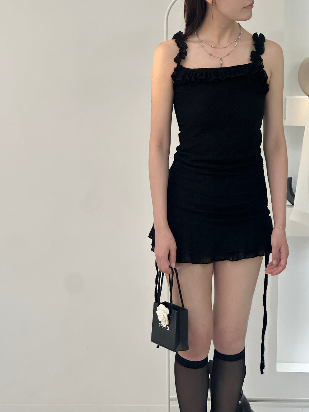 사랑스러운 프릴 디테일과 슬림한 실루엣이 매력적인 블랙 원피스예요.