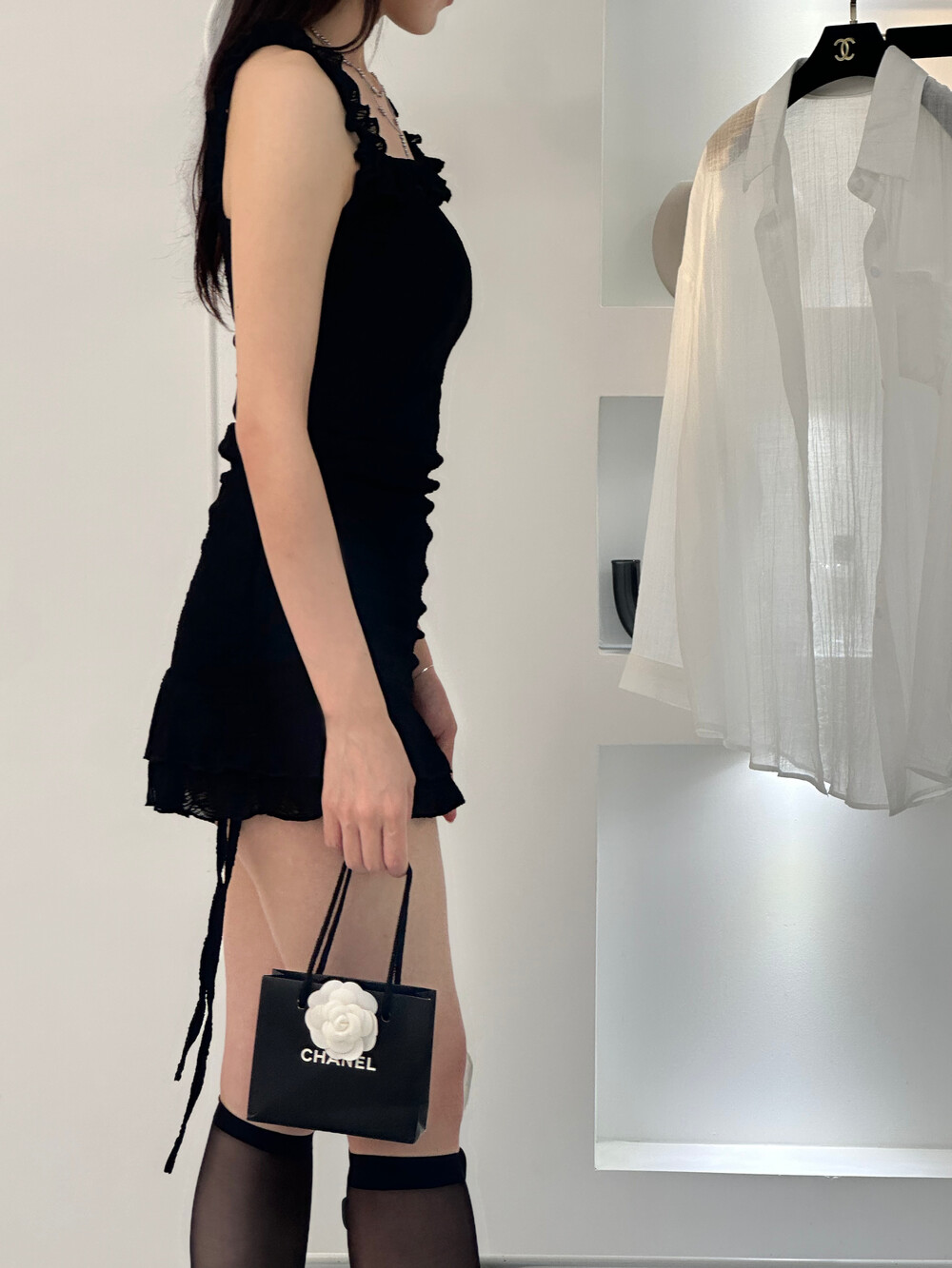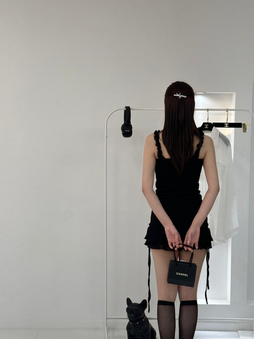밑단 프릴과 어깨 프릴 스트랩이 포인트가 되어 러블리하면서도 발레코어 무드를 느낄 수 있어요.