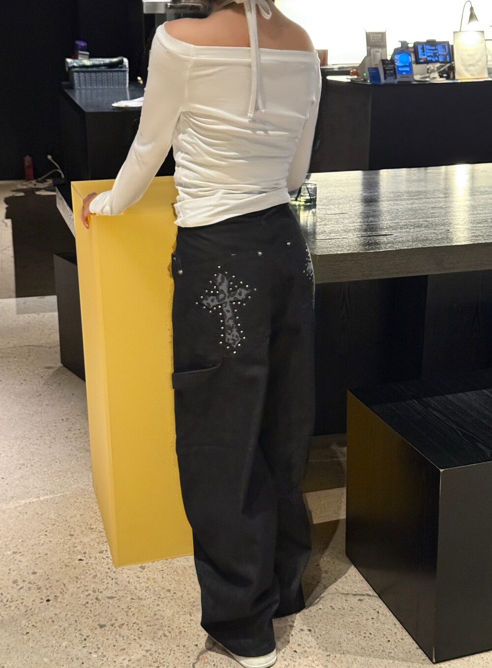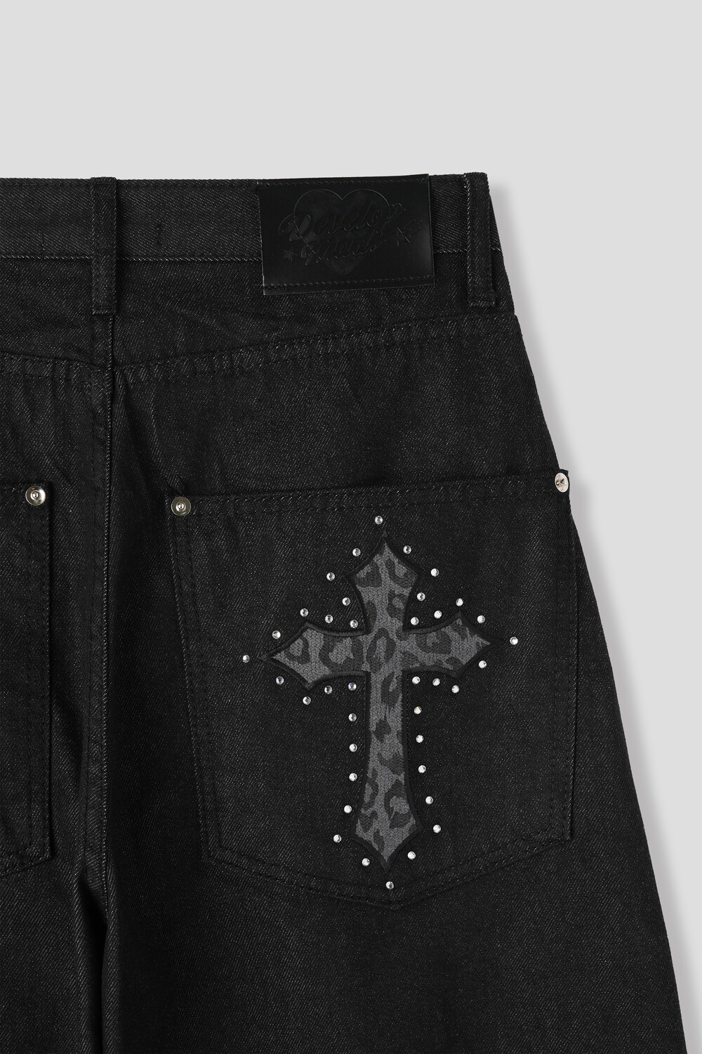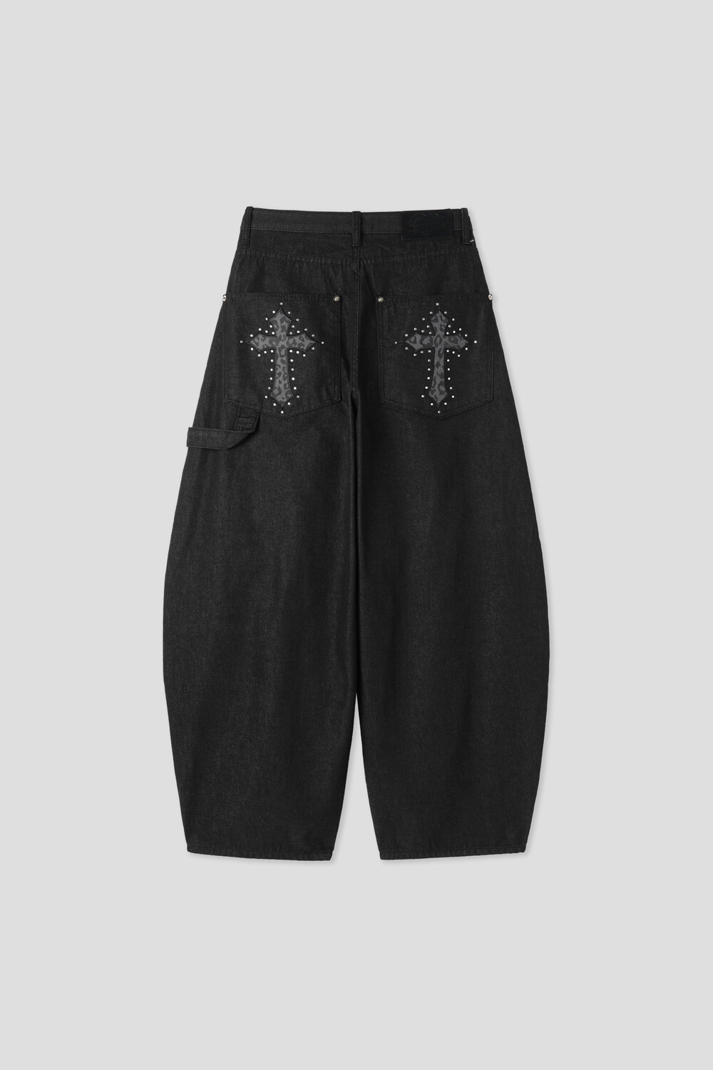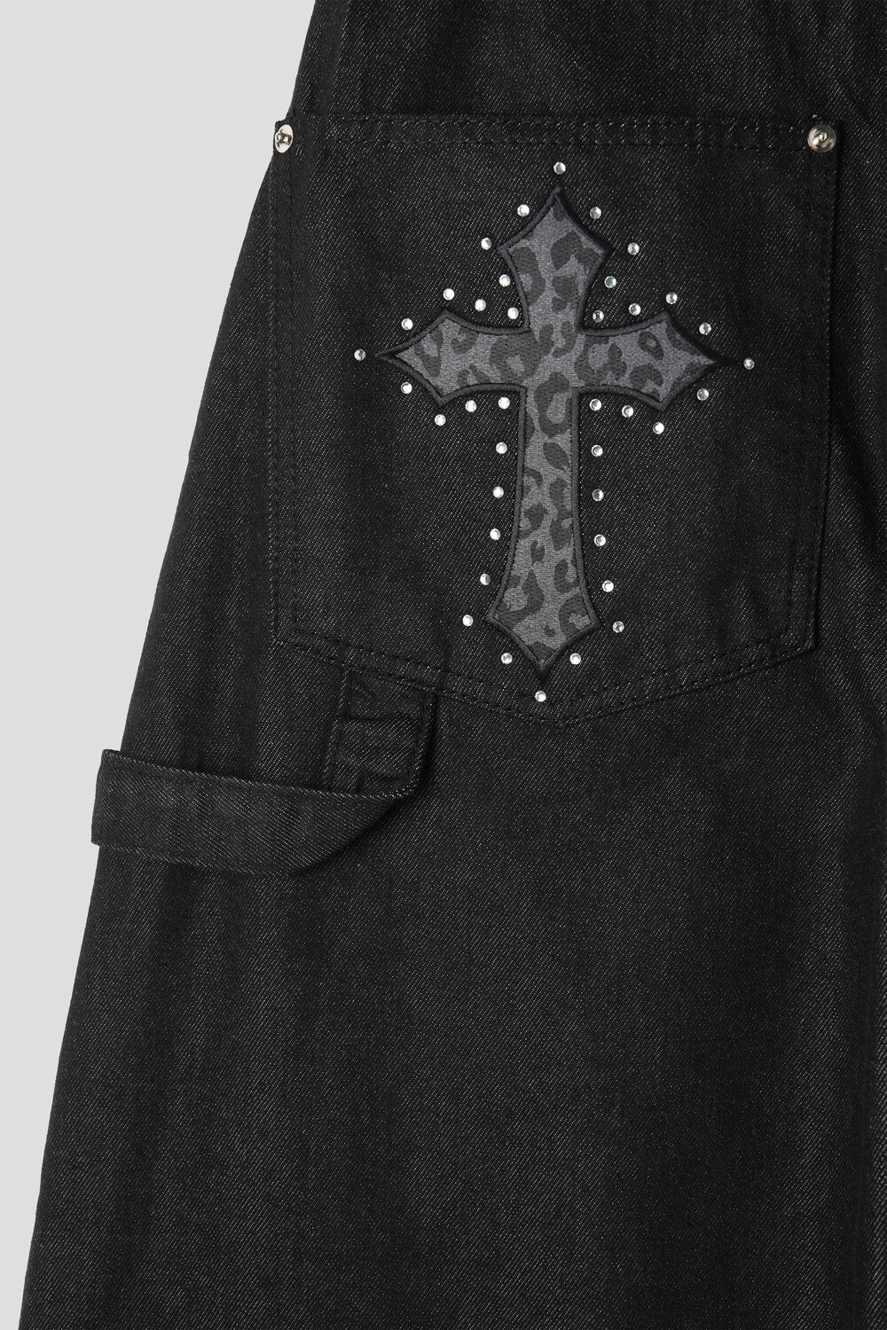 뒷포켓의 크로스 스터드 디테일이 시선을 확 사로잡고