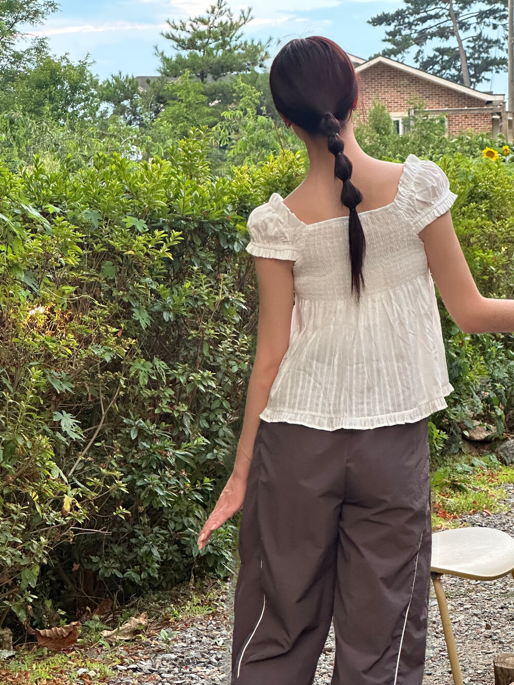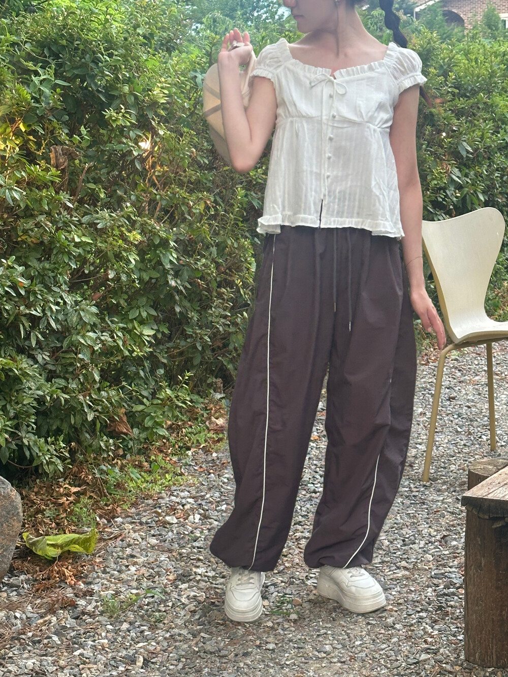 가볍고 바스락거리는 나일론 텍스처로 시원한 착용감을 느낄 수 있으며 양 옆으로 배색 파이핑 라인을 넣어 실루엣을 정리해주고 길어 보이게 연출해 줘요.