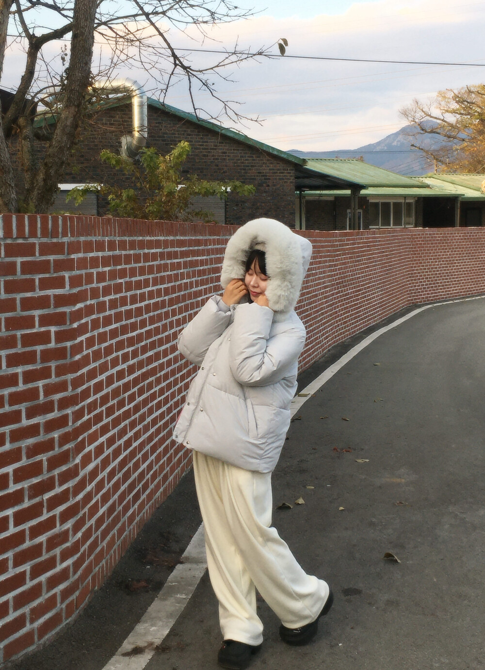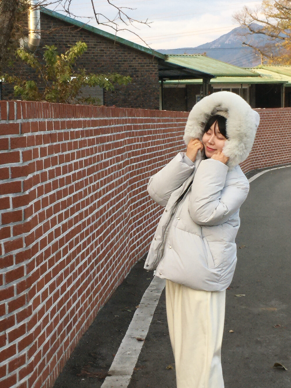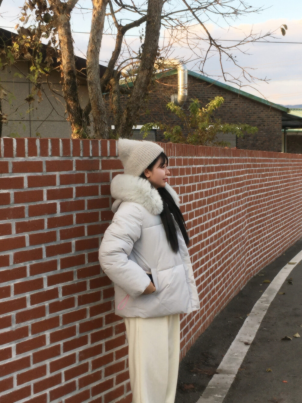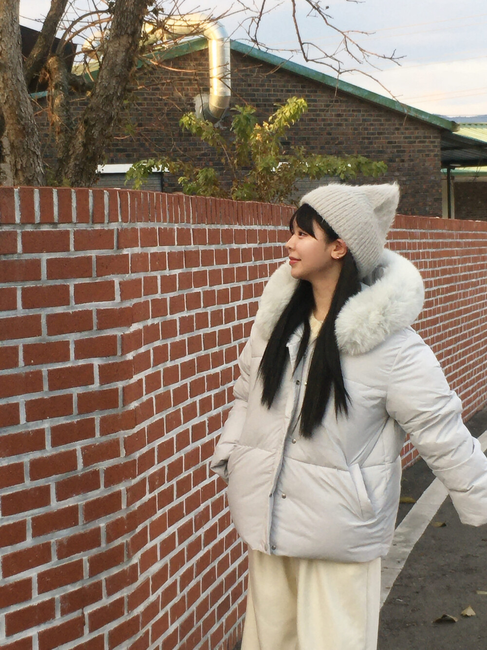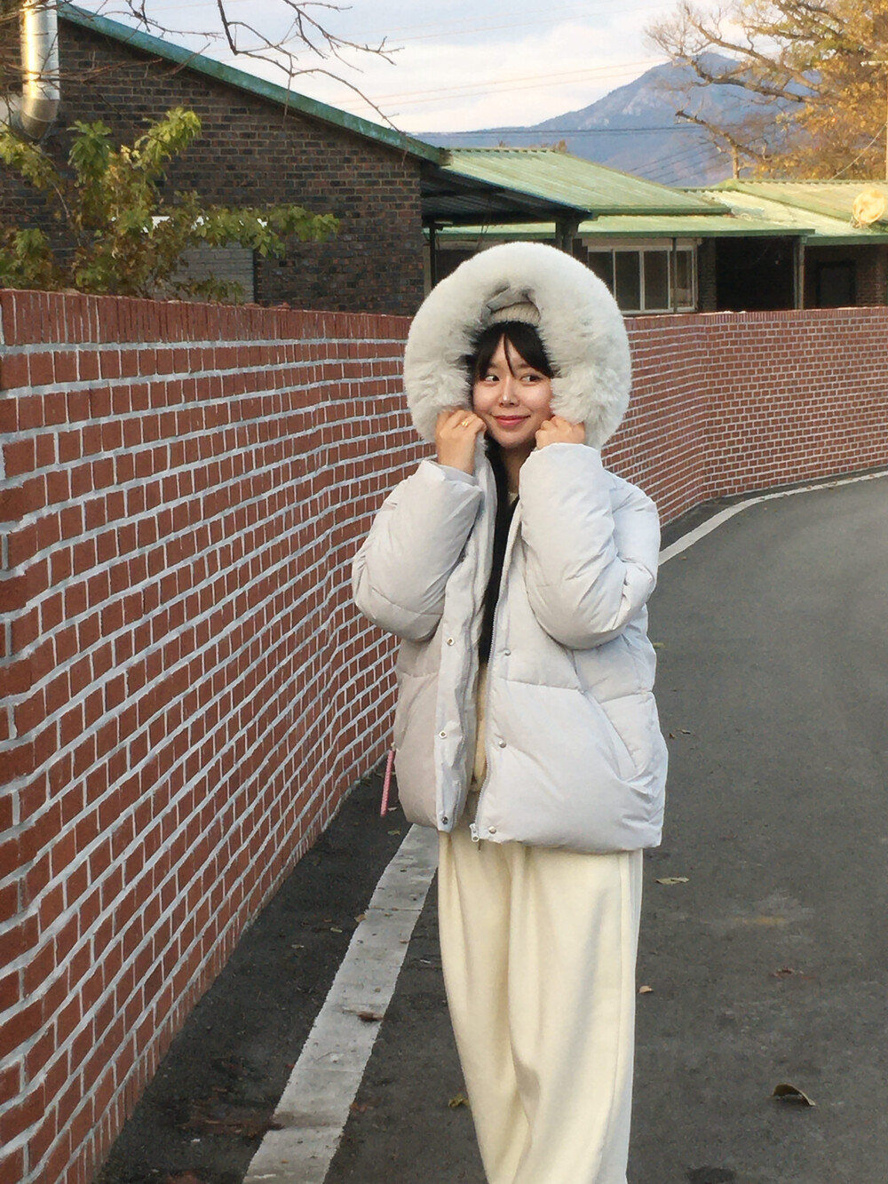 얼굴을 폭 감싸는 큰 모자 디자인 덕분에 한겨울 바람에도 걱정 없이 따뜻하게 즐기기 좋은 겨울 데일리 패딩입니다 :)