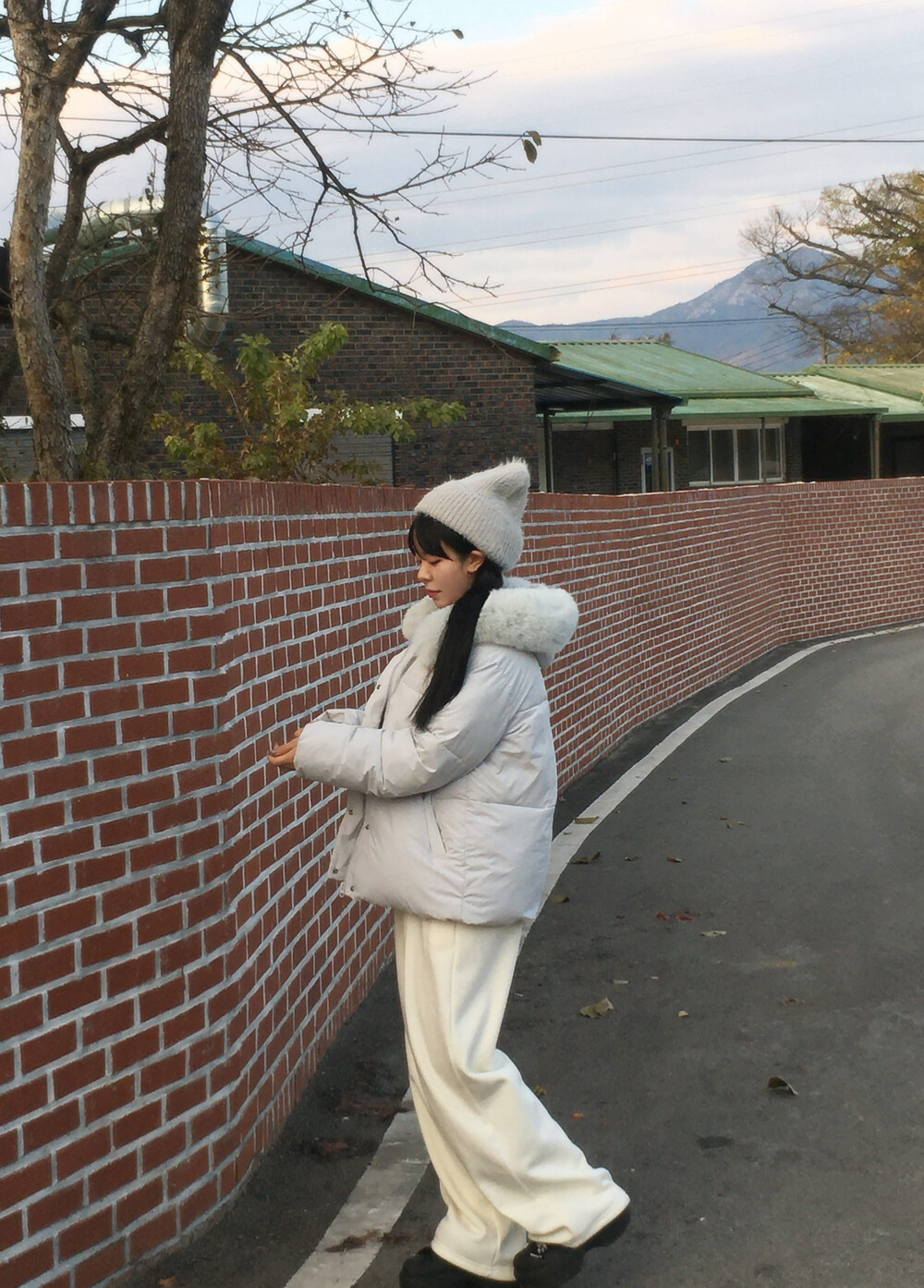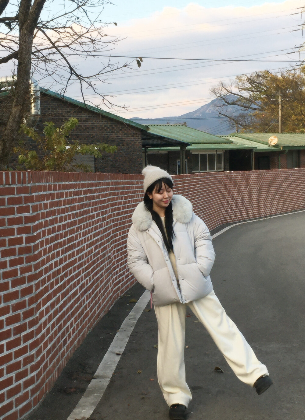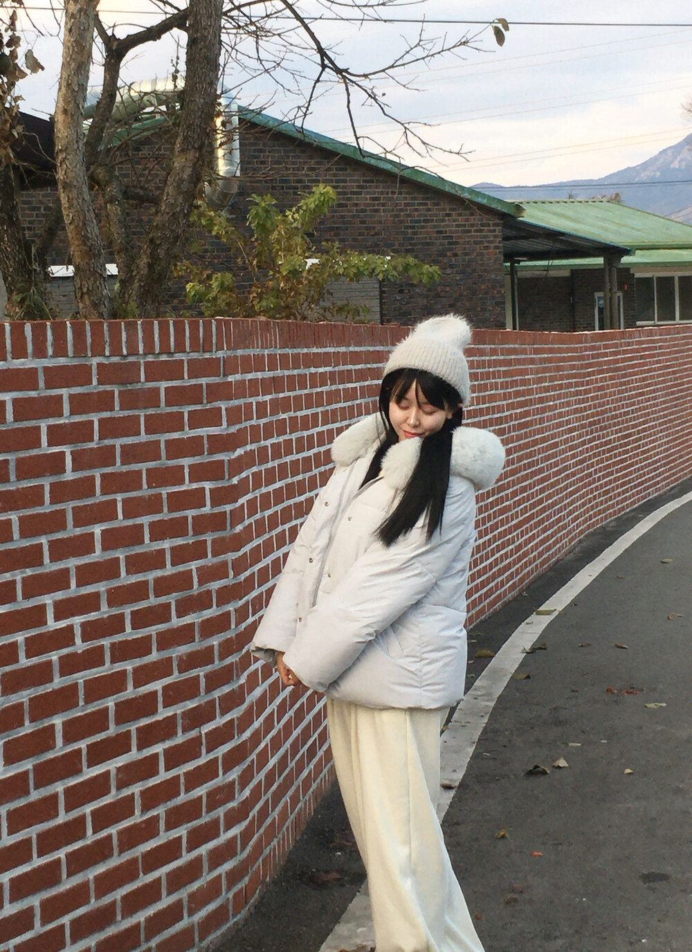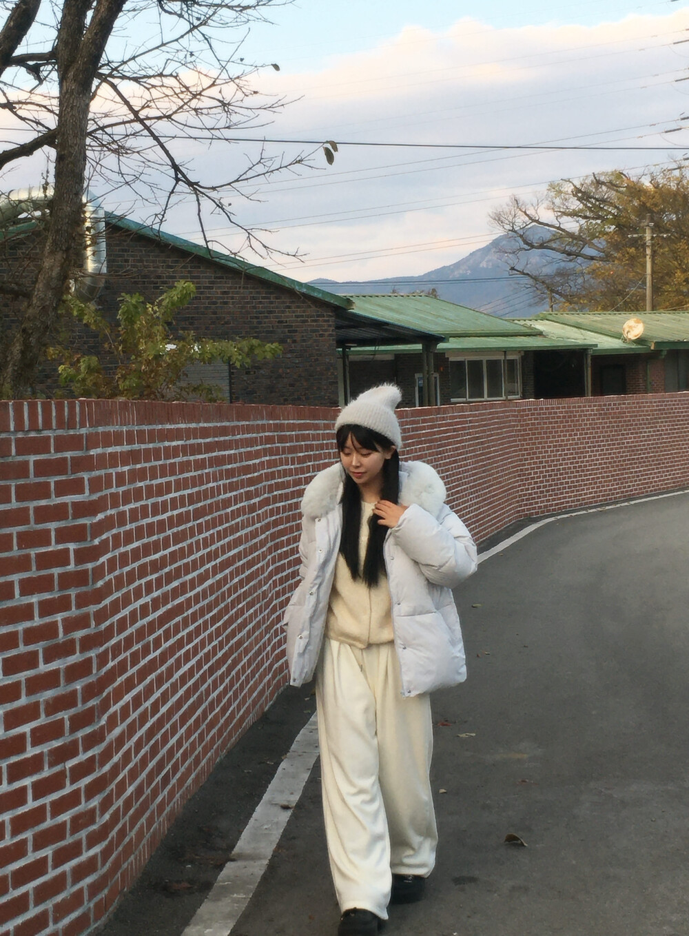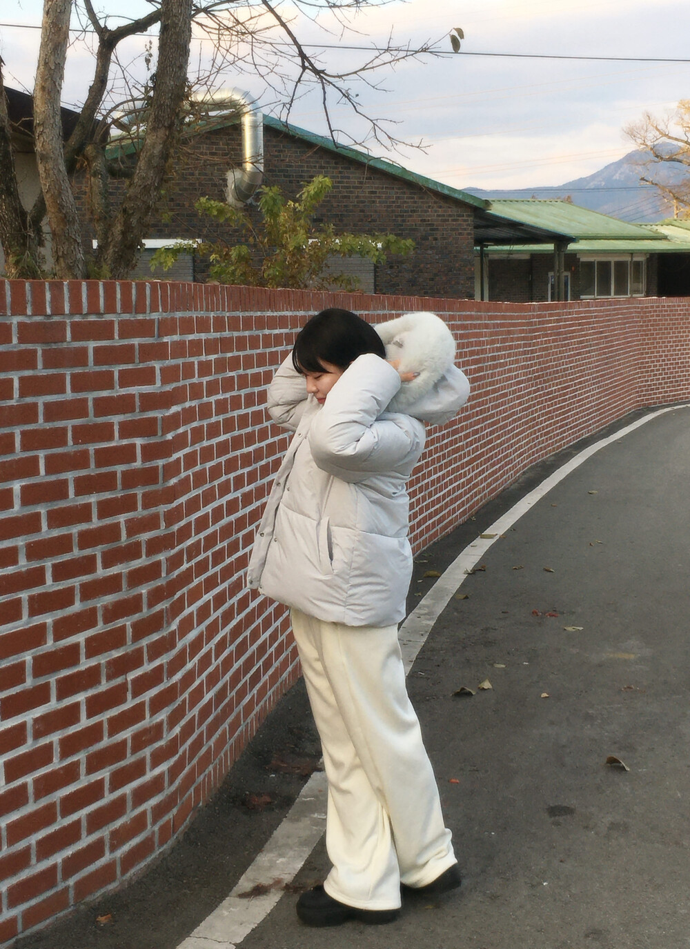 얼굴을 폭 감싸는 큰 모자 디자인 덕분에 한겨울 바람에도 걱정 없이 따뜻하게 즐기기 좋은 겨울 데일리 패딩입니다 :)