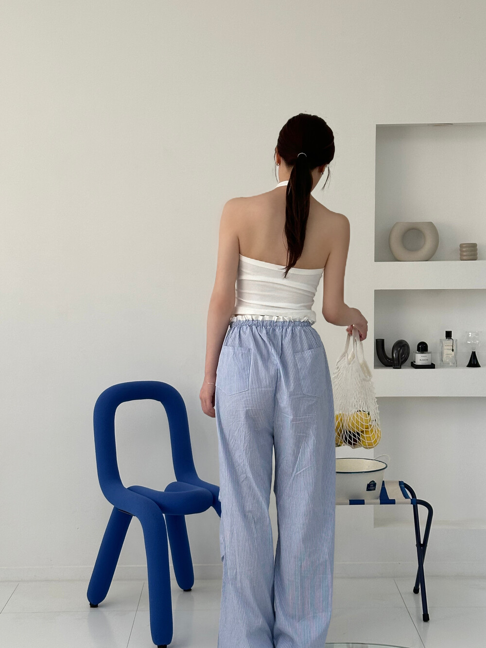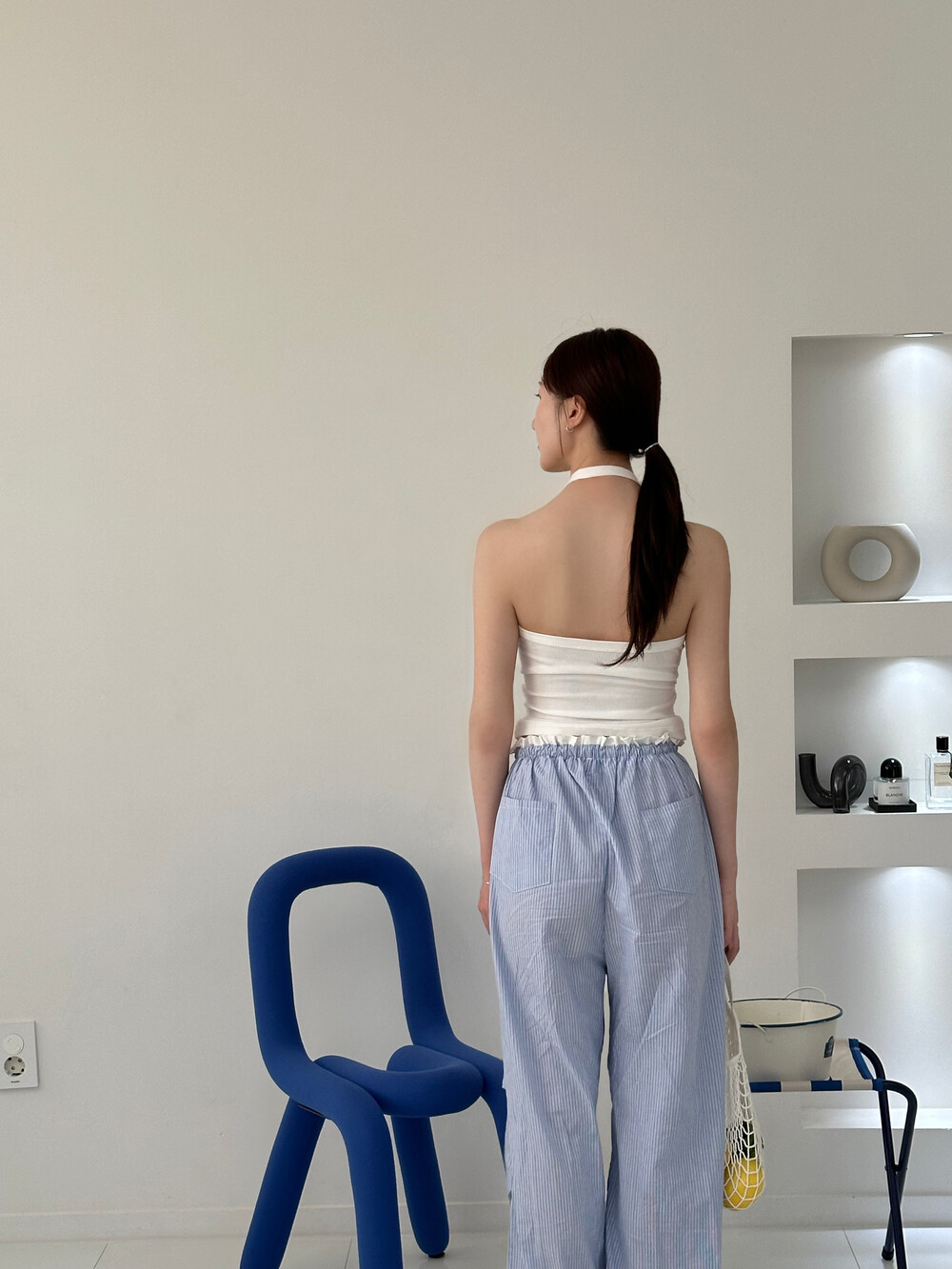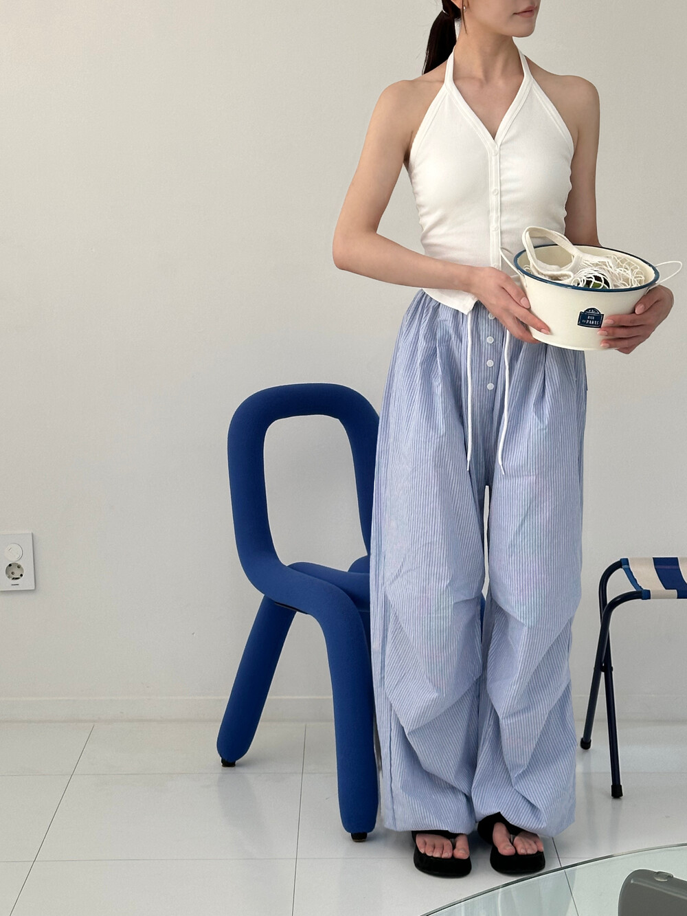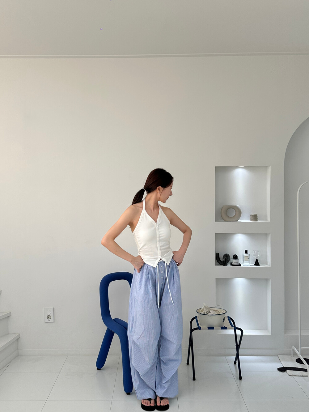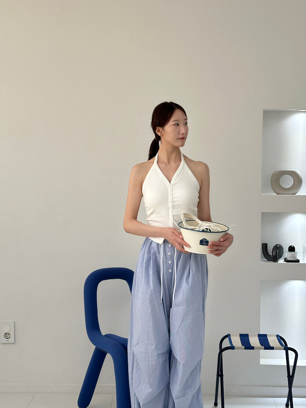 넥라인을 따라 감싸주는 홀터 스트랩과 앞중심의 버튼 디테일로 심플하면서도 은은한 포인트를 더했어요.