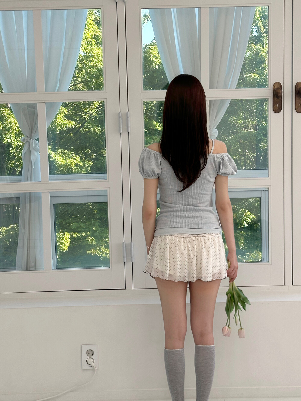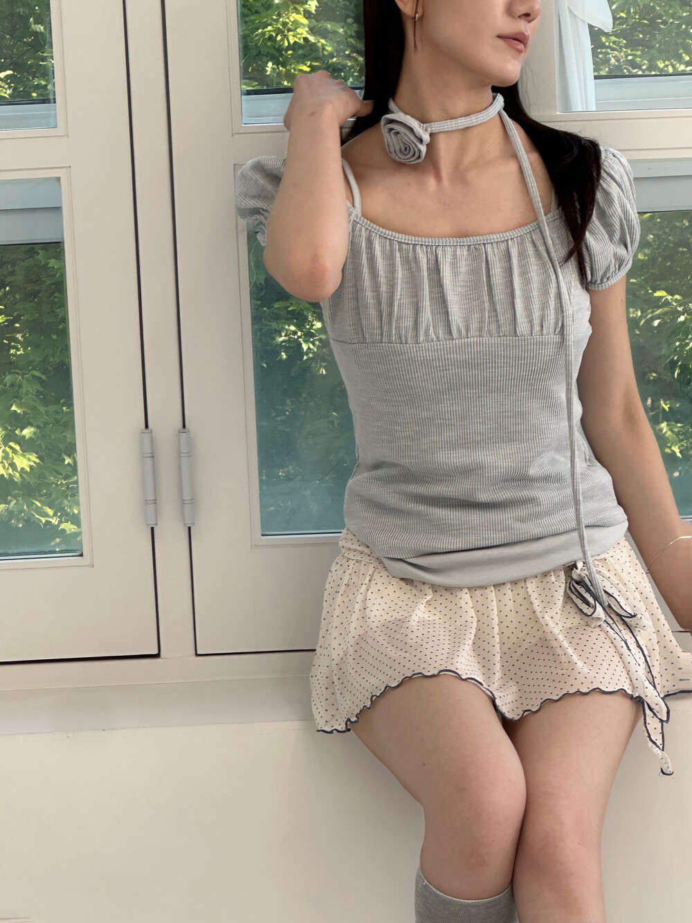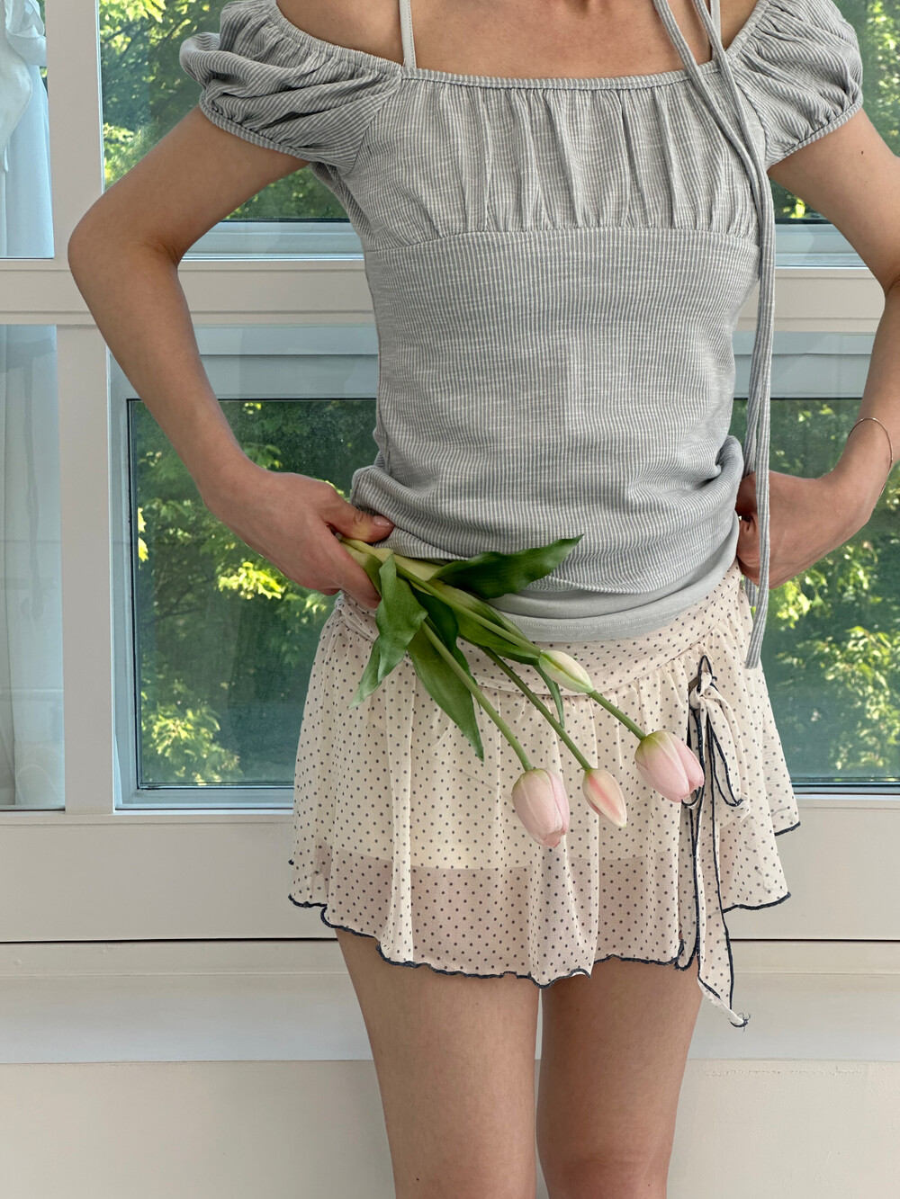잔잔한 도트 패턴과 리본 스트랩이 사랑스럽게 어우러진 스커트예요.