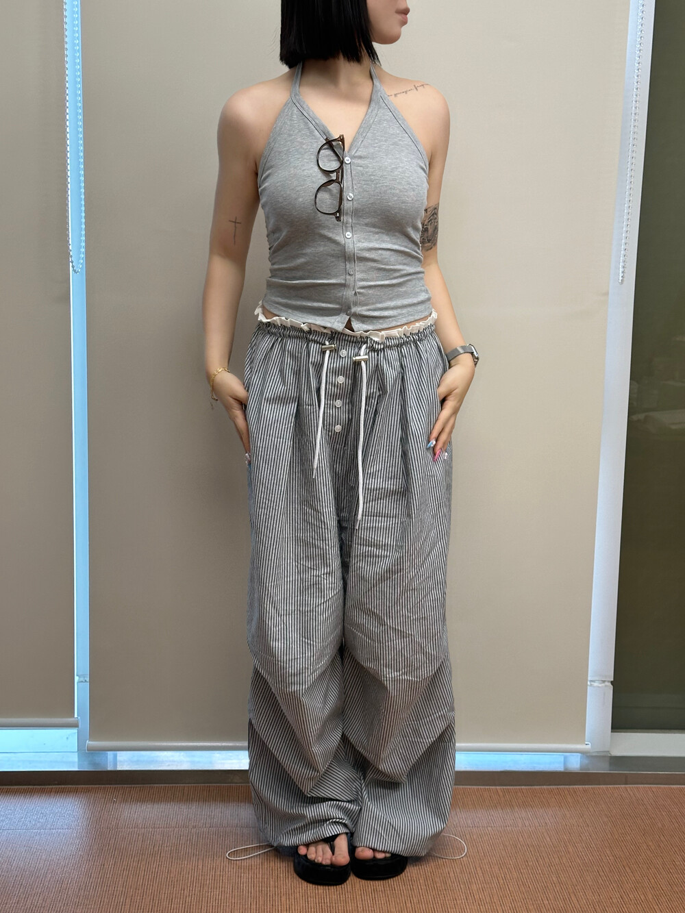 넥라인을 따라 감싸주는 홀터 스트랩과 앞중심의 버튼 디테일로 심플하면서도 은은한 포인트를 더했어요.