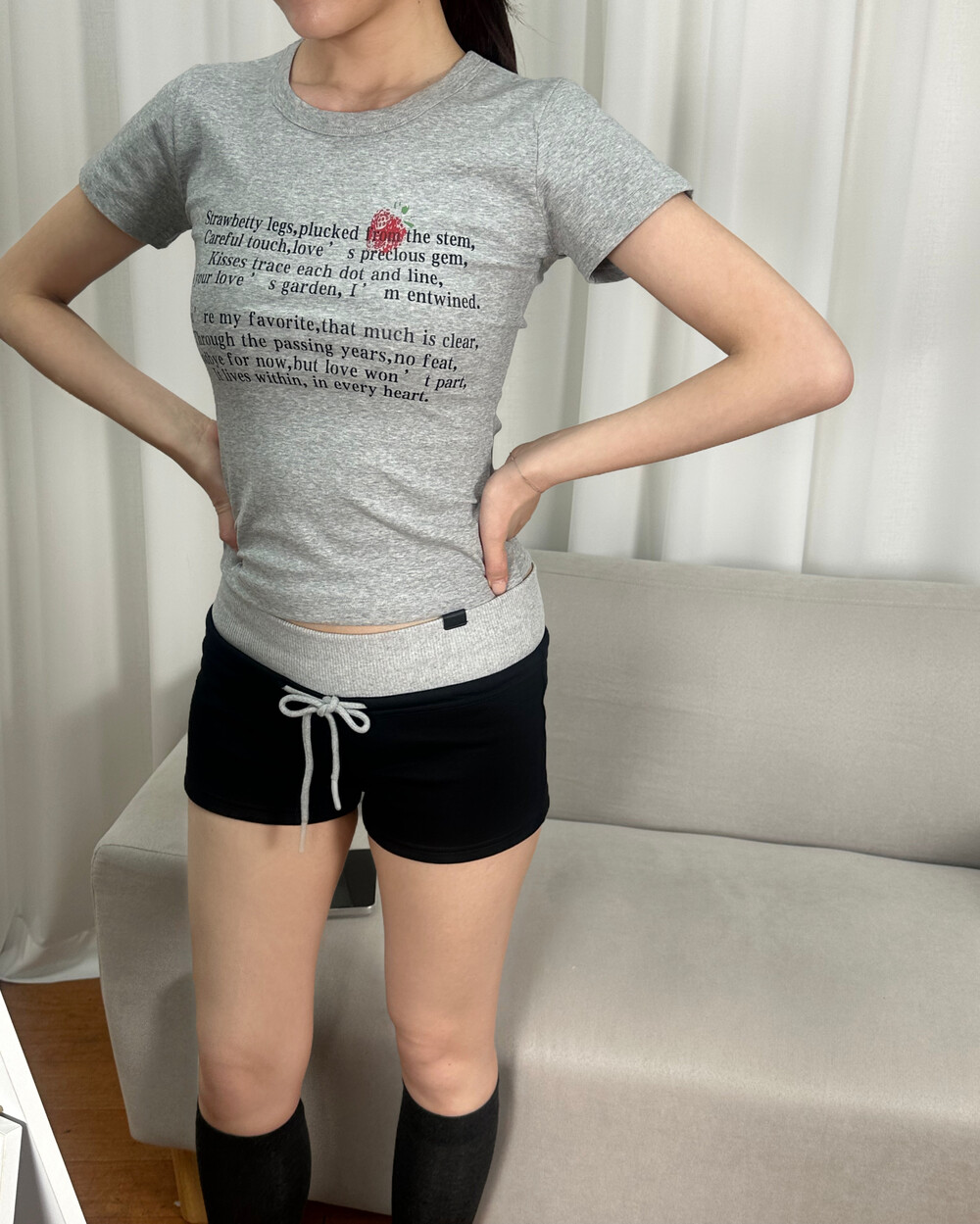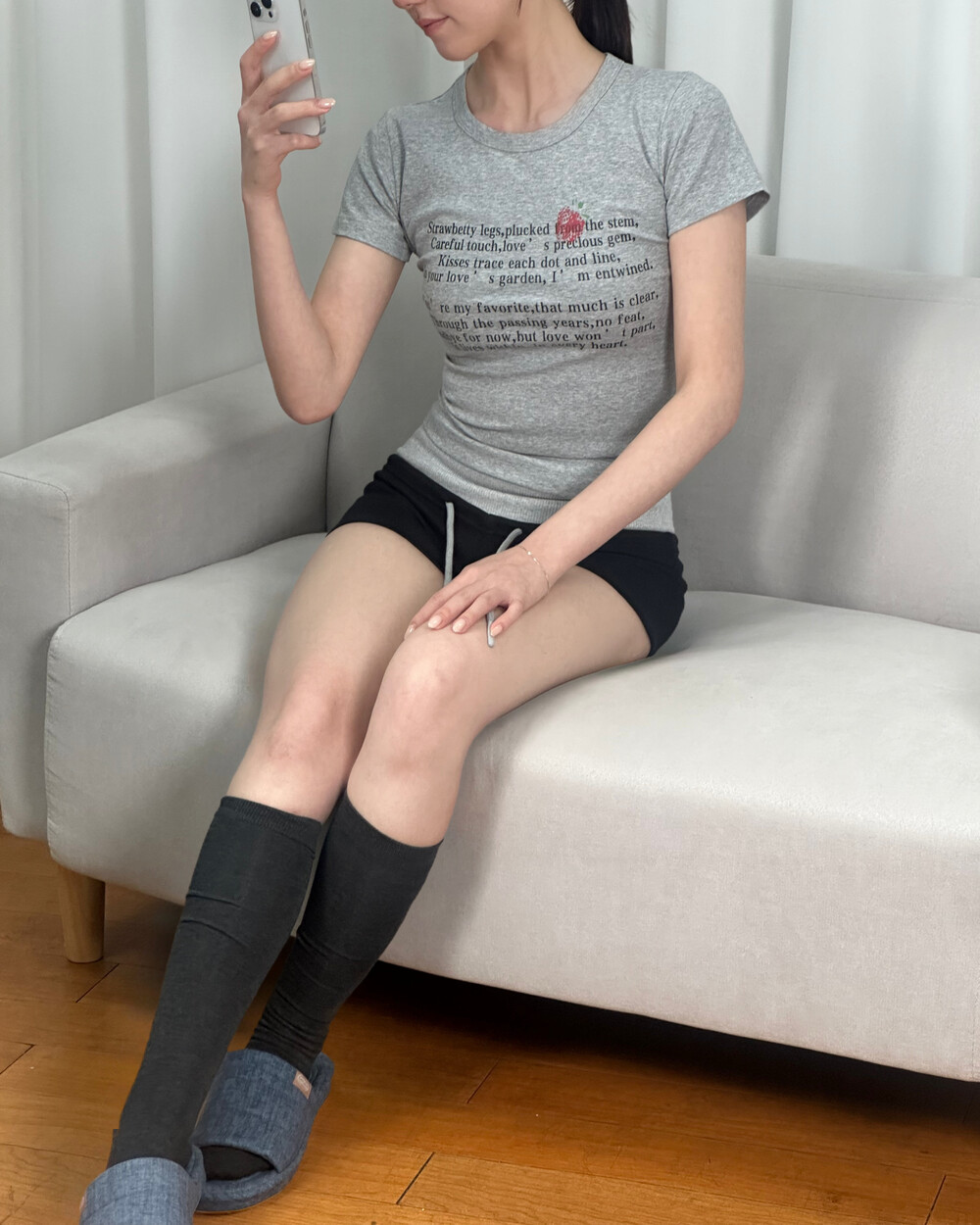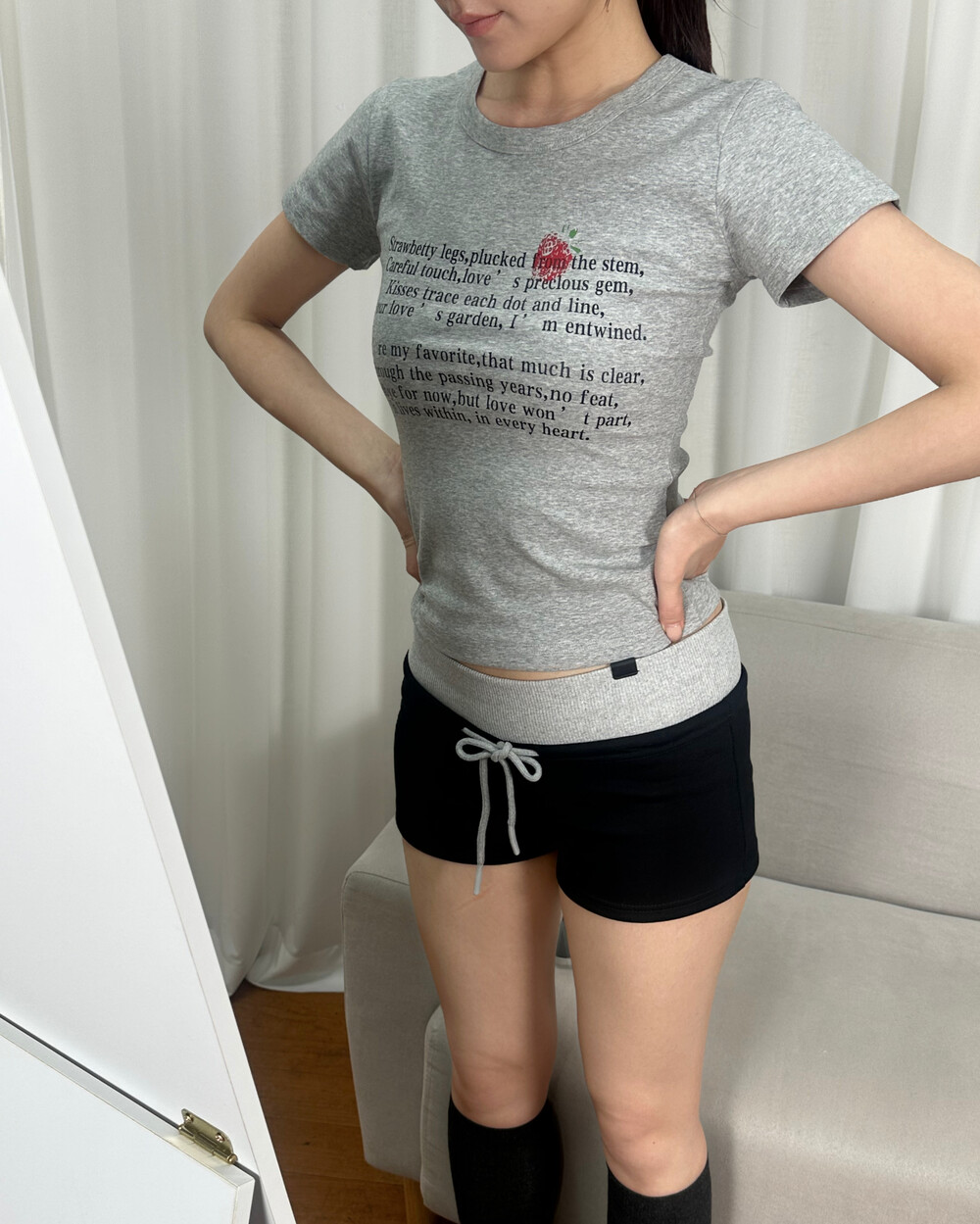 사랑스러운 딸기와 감성 레터링 문구가 어우러져 단독 착용만으로도 발레코어 & 코케트 무드 완성 ゚・。♥。・゚