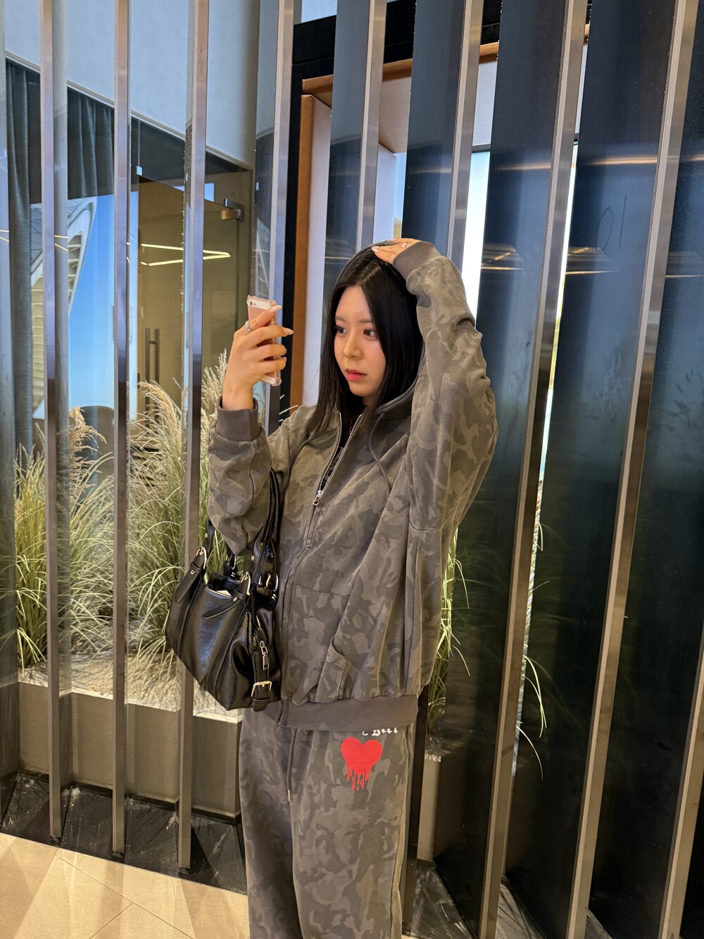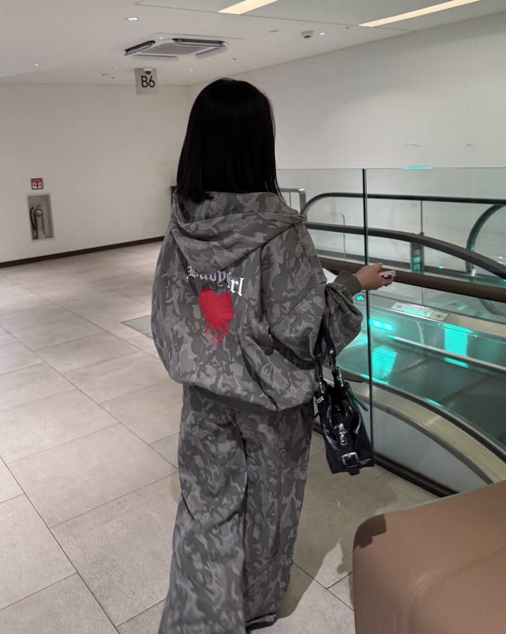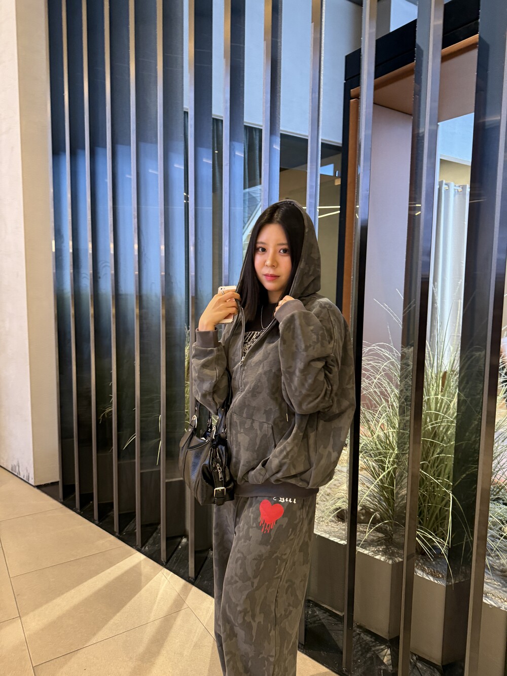 빈티지 카모 패턴에 레드 하트 그래픽 포인트