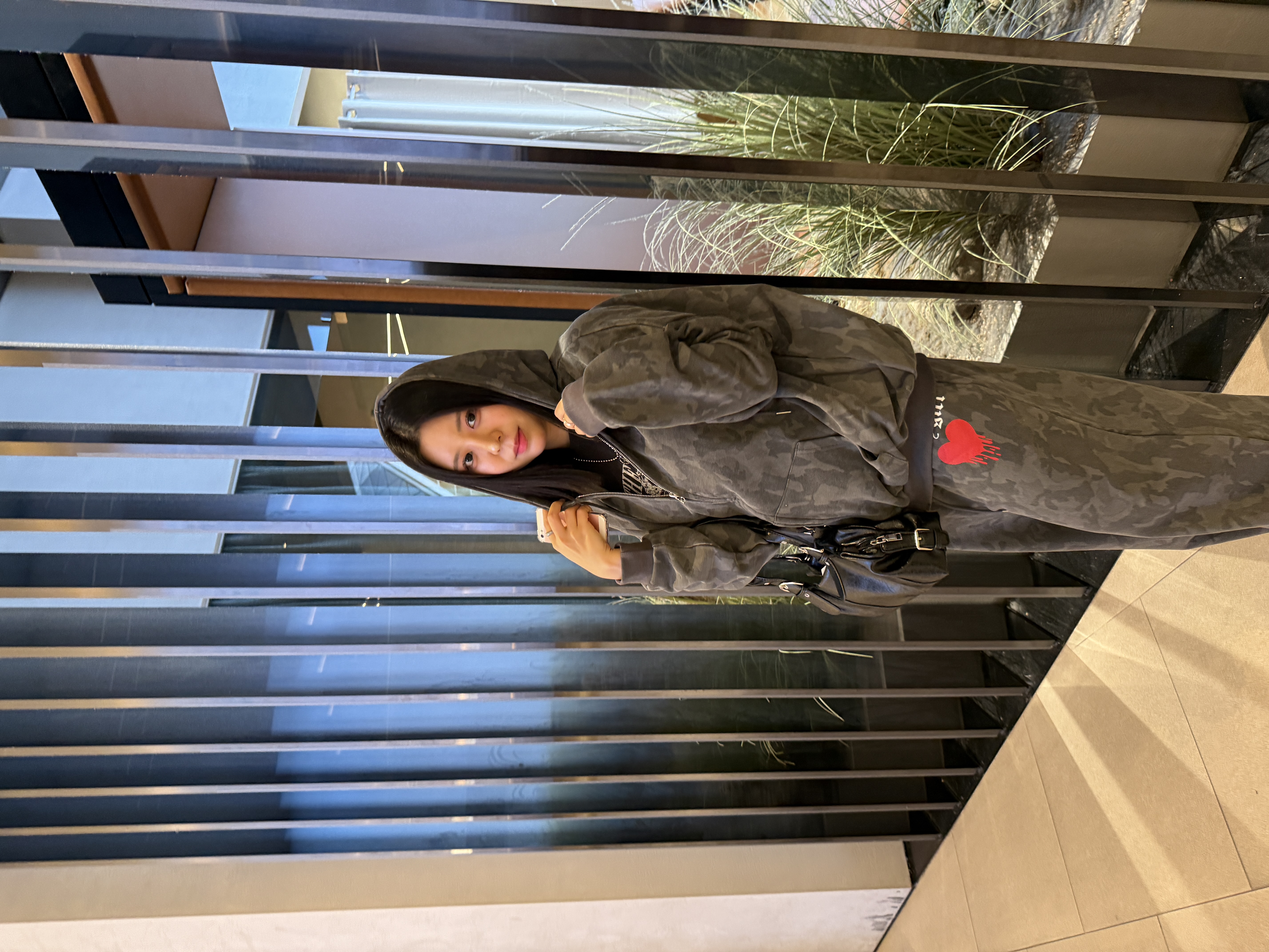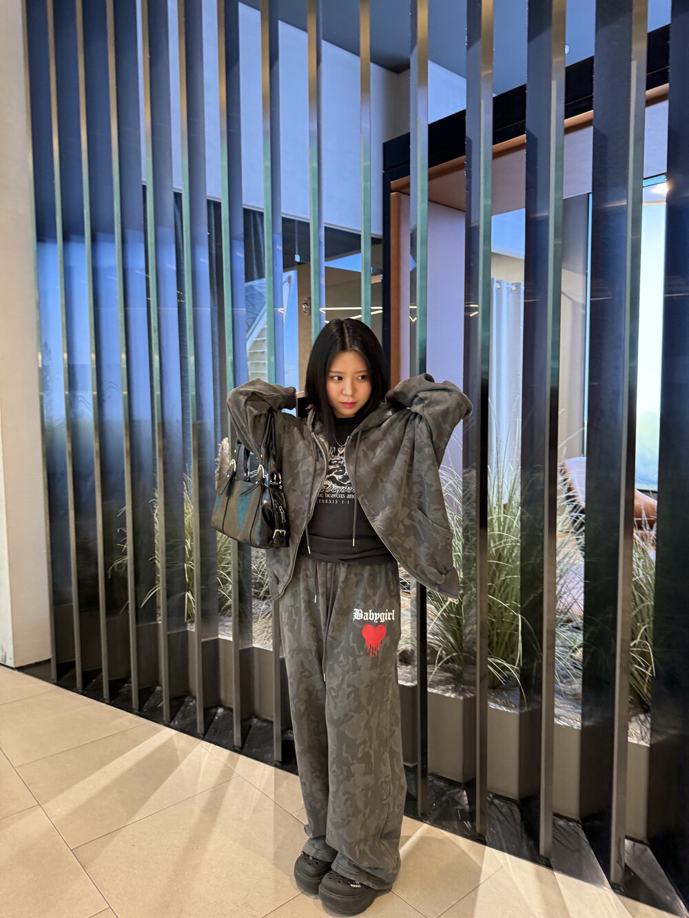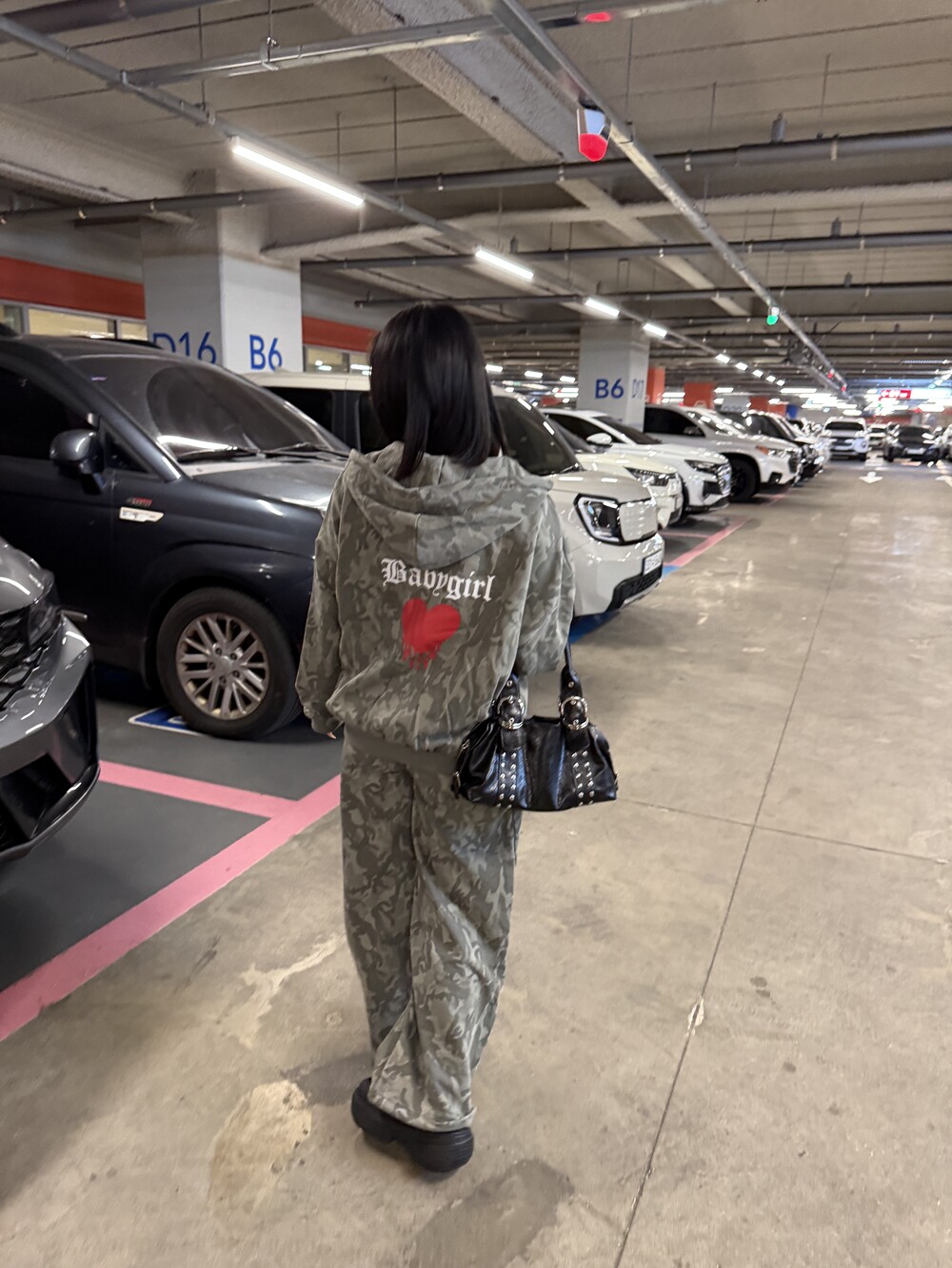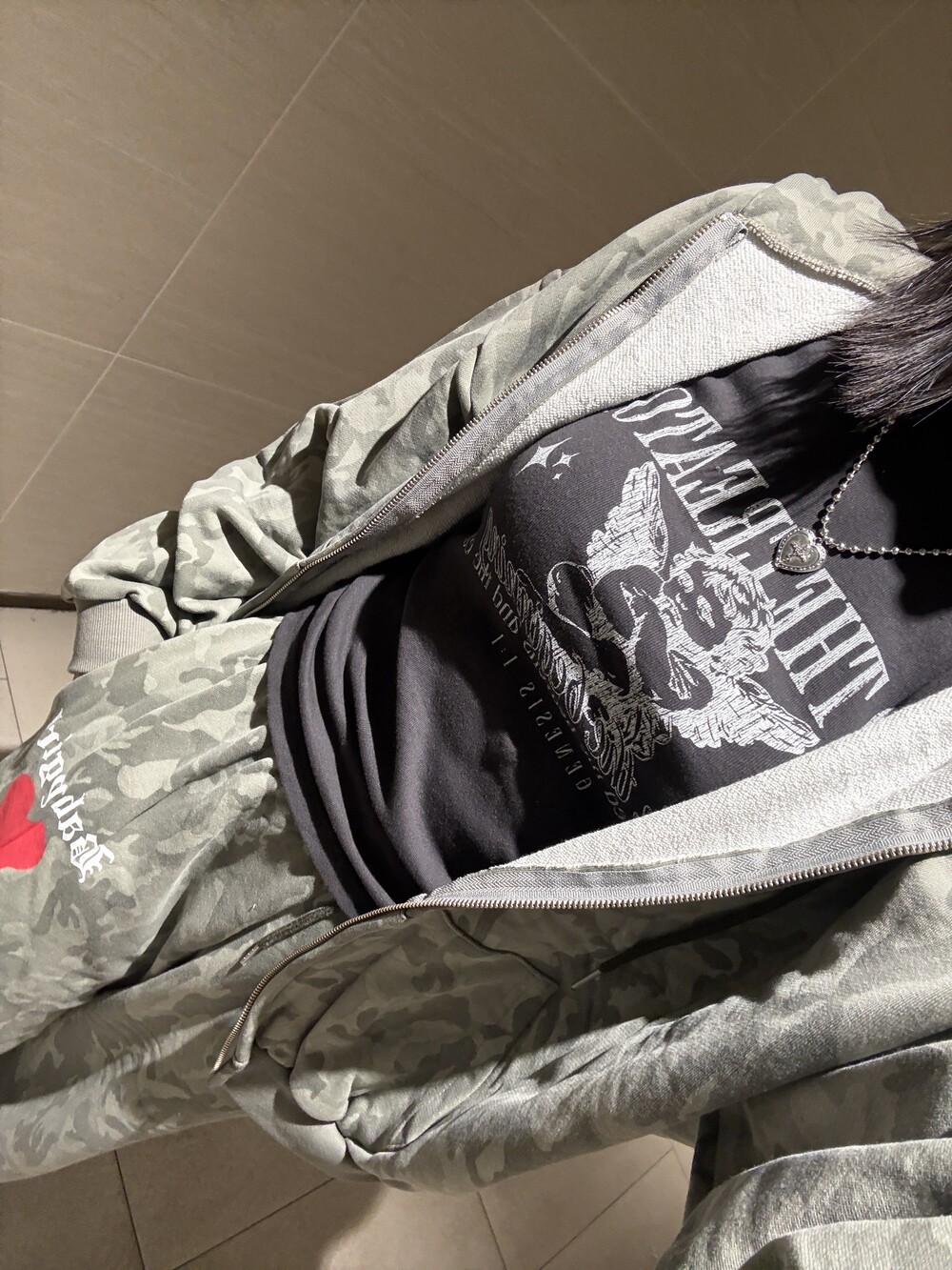 빈티지 카모 패턴에 레드 하트 그래픽 포인트