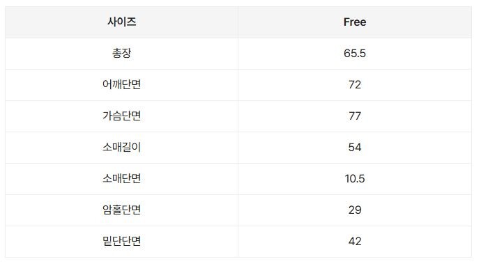 [TOP] 총장 65.5 / 어깨 72 / 가슴 77 / 소매길이 54 / 암홀 29
