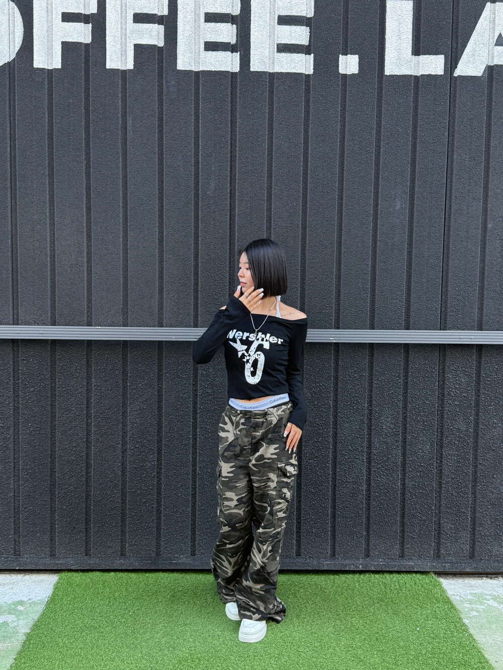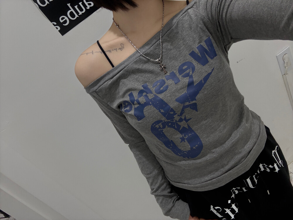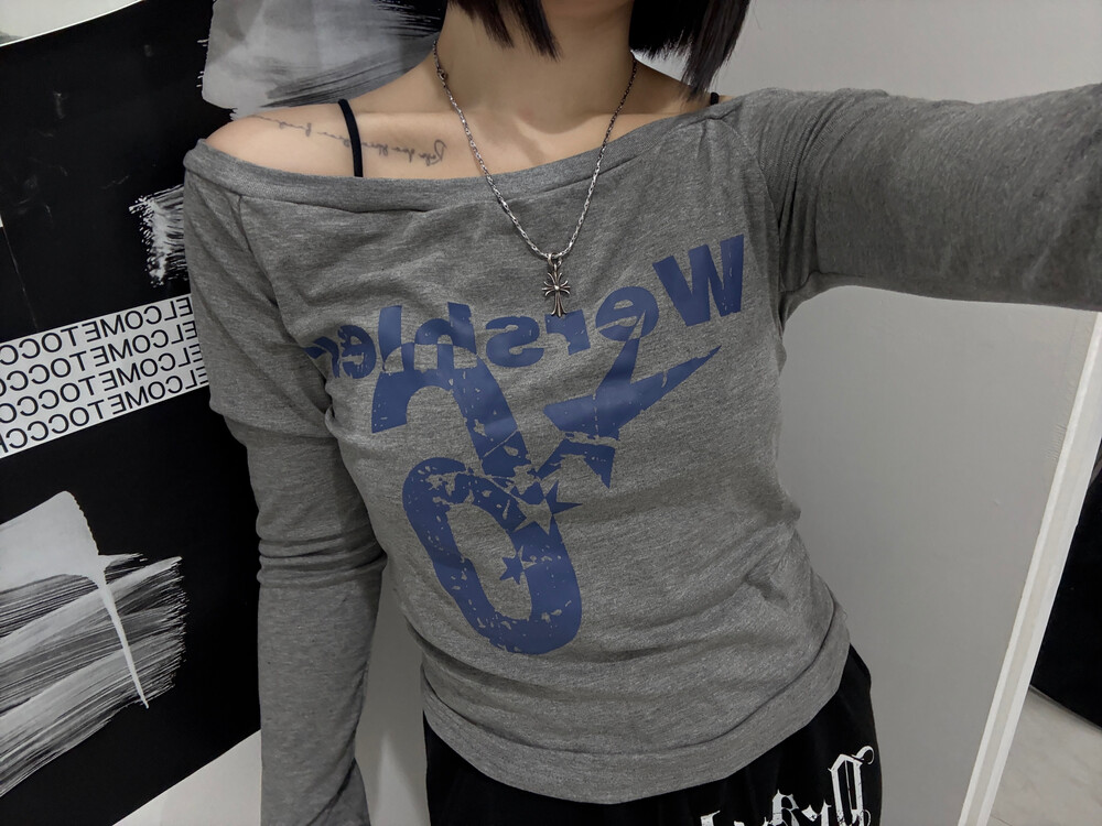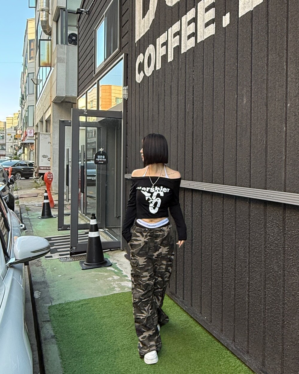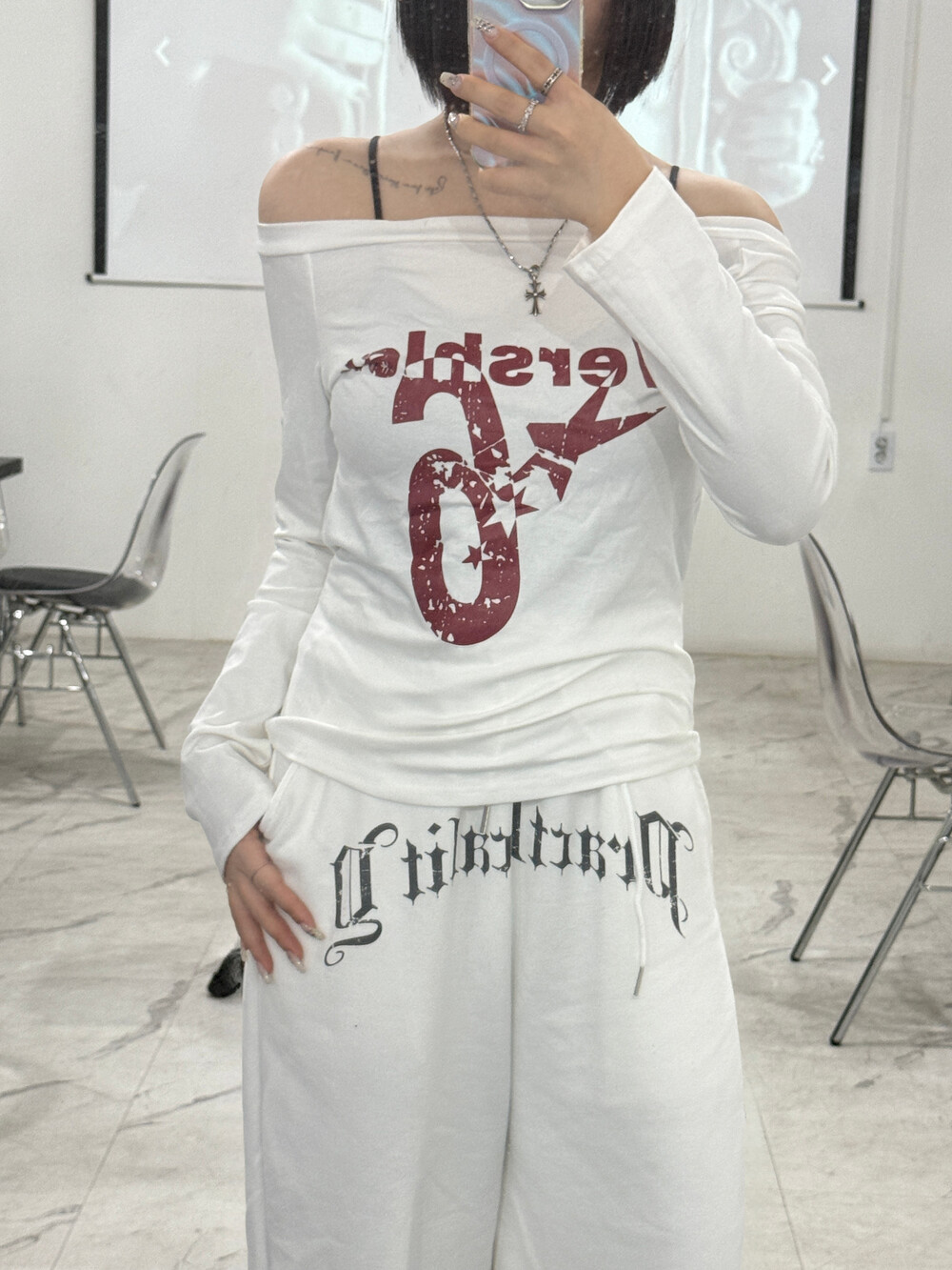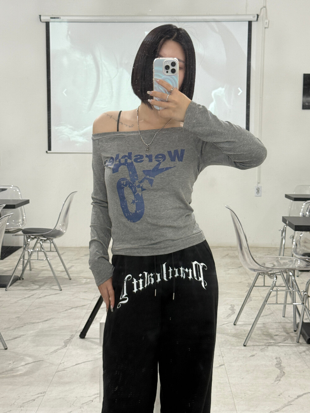 빈티지하면서도 힙한 무드의 오프숄더 티셔츠예요.