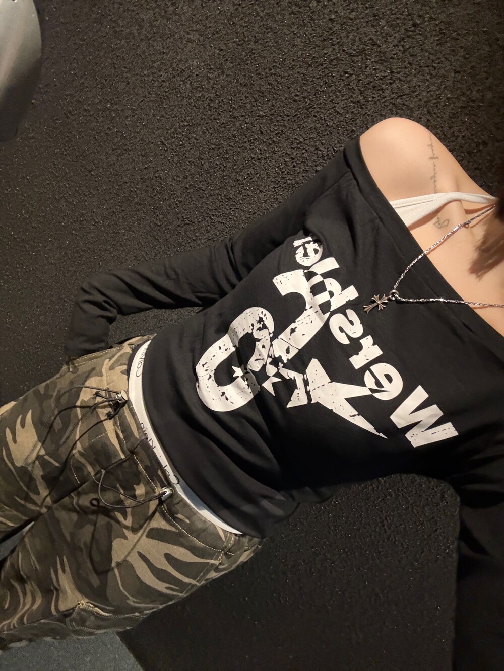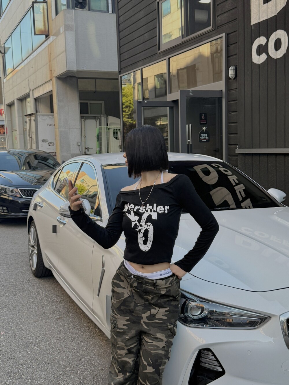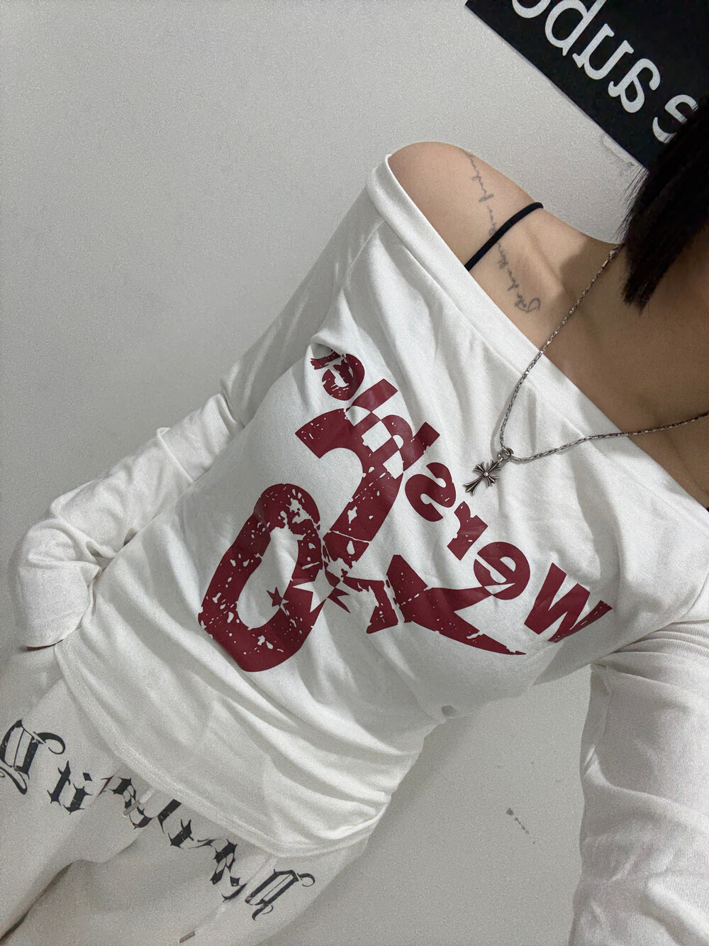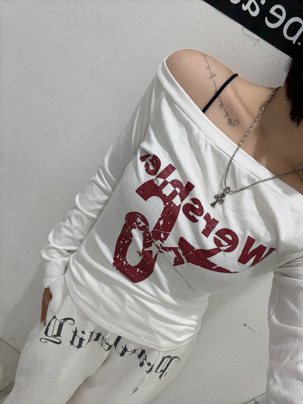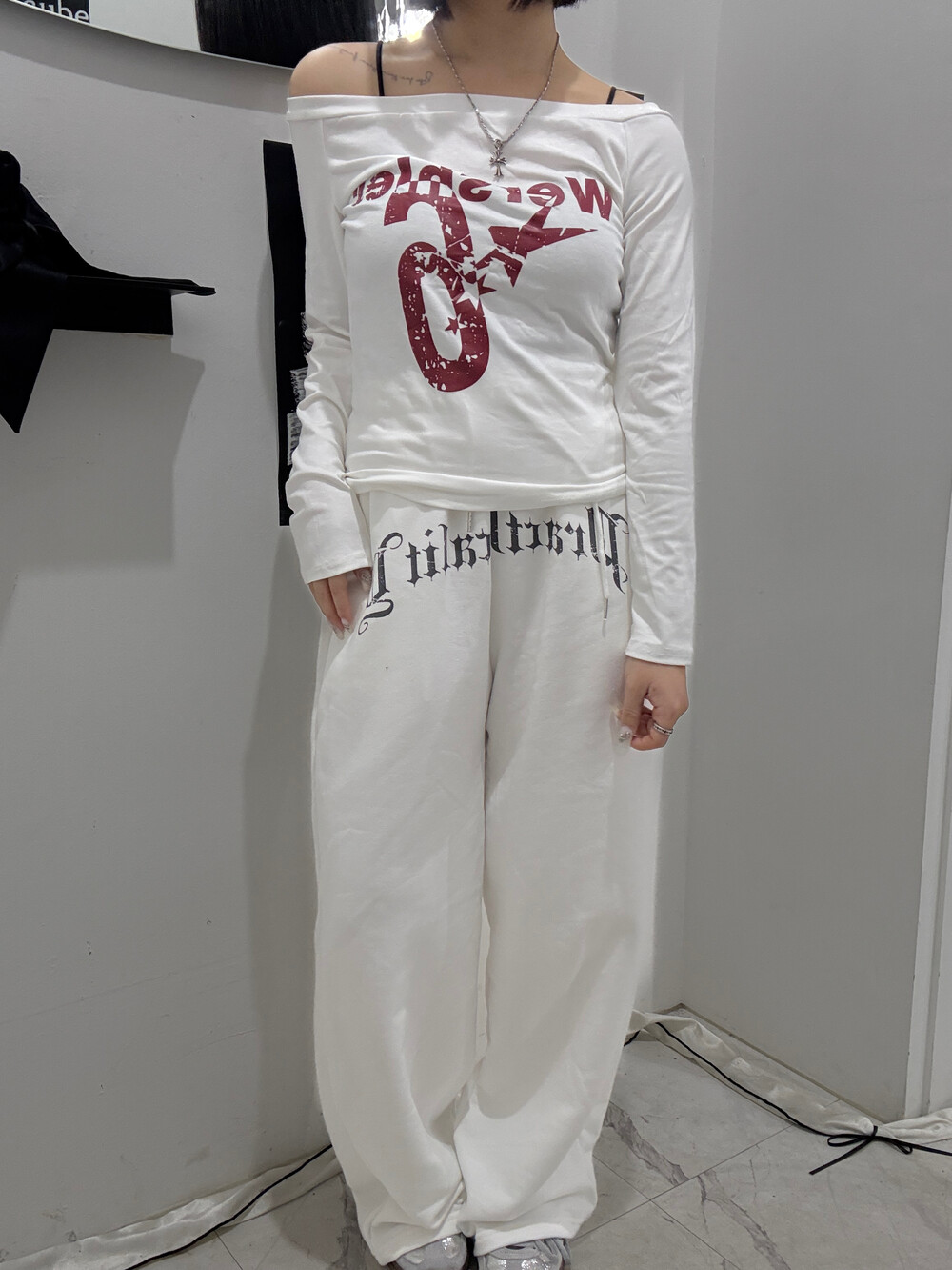 빈티지하면서도 힙한 무드의 오프숄더 티셔츠예요.