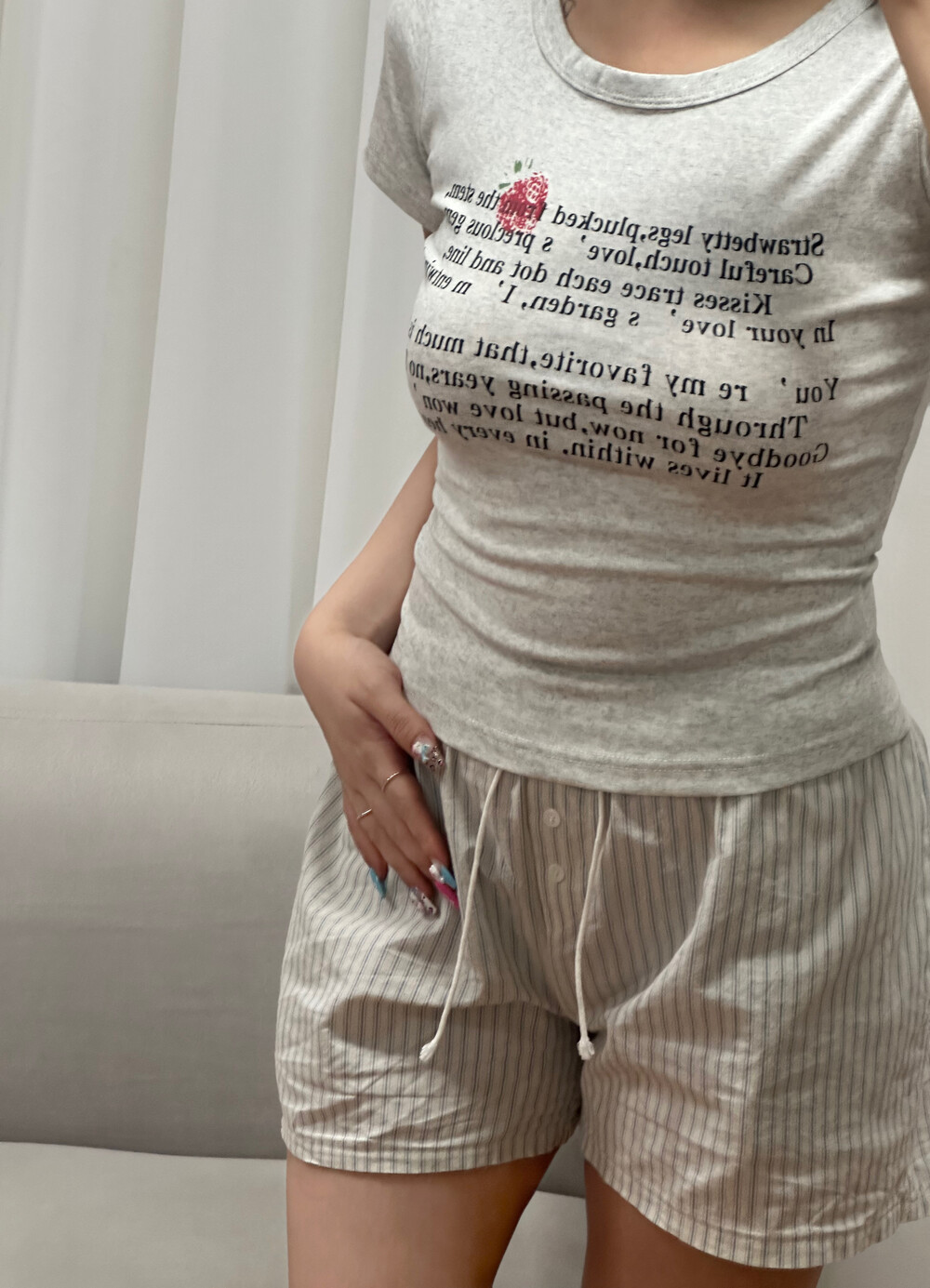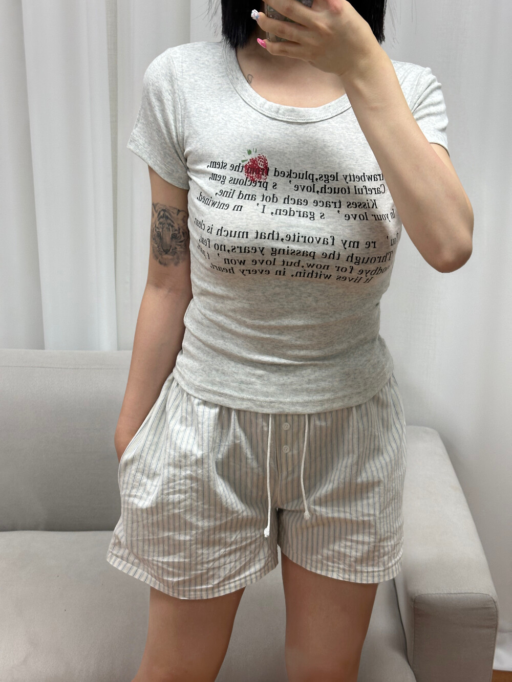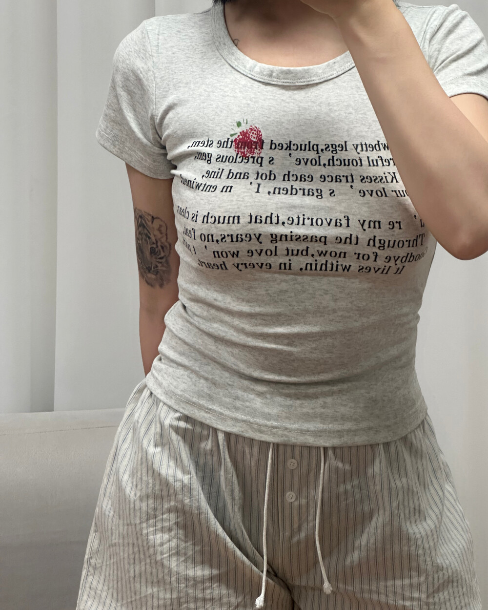 사랑스러운 딸기와 감성 레터링 문구가 어우러져 단독 착용만으로도 발레코어 & 코케트 무드 완성 ゚・。♥。・゚