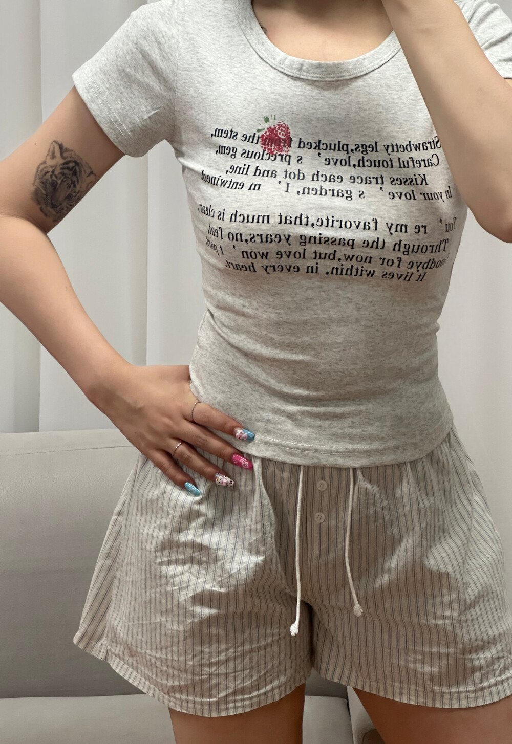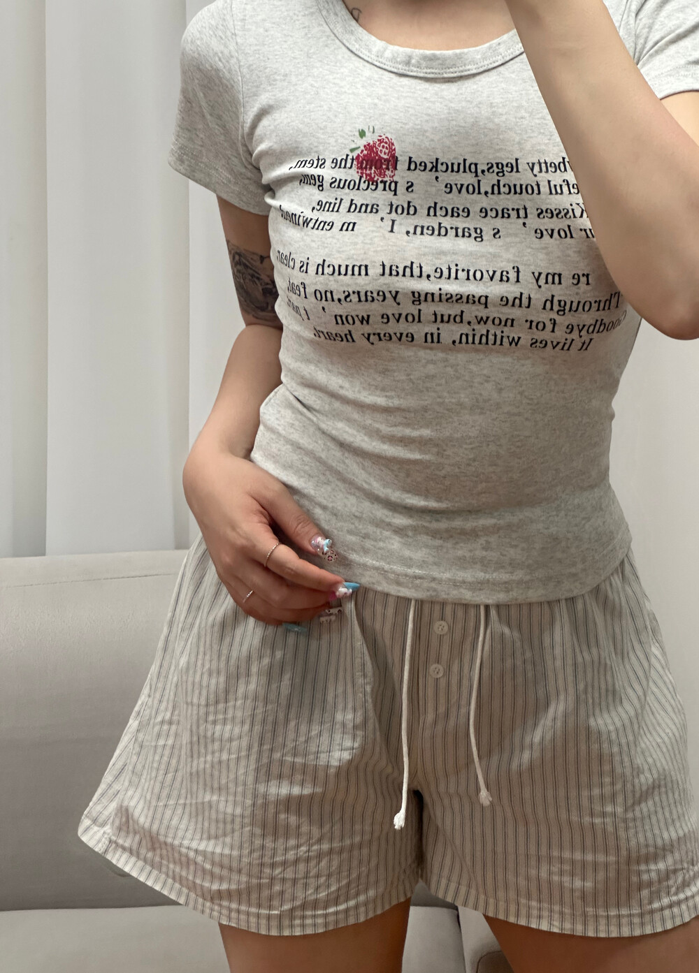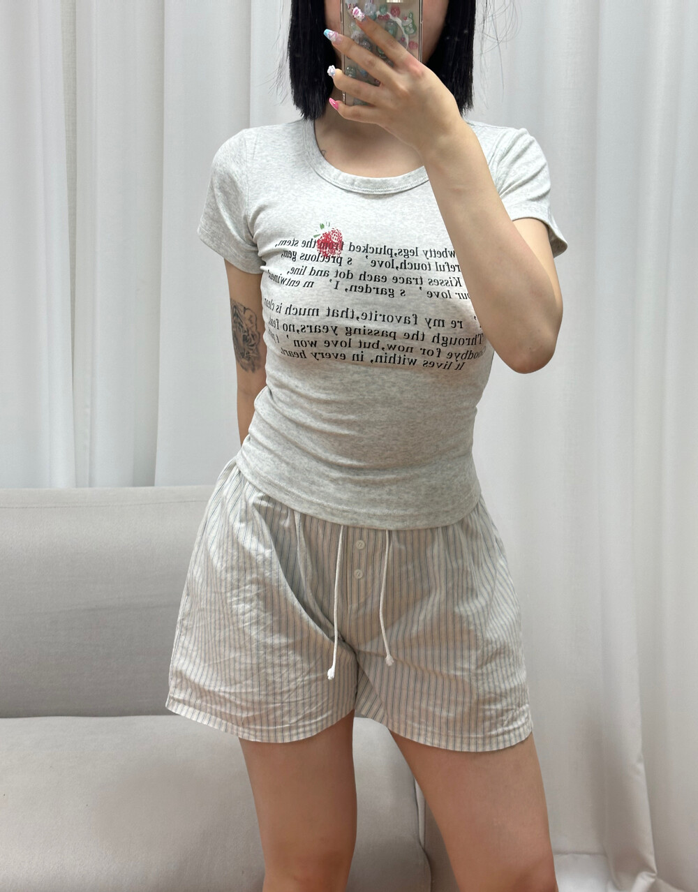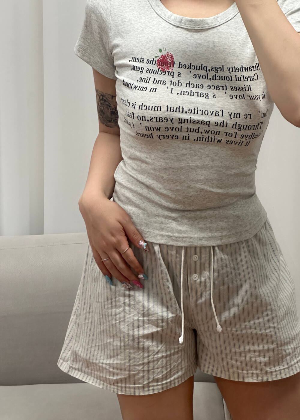 사랑스러운 딸기와 감성 레터링 문구가 어우러져 단독 착용만으로도 발레코어 & 코케트 무드 완성 ゚・。♥。・゚