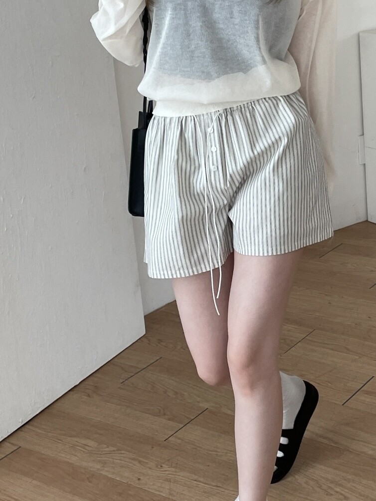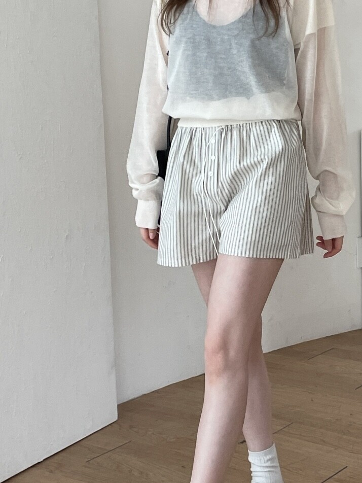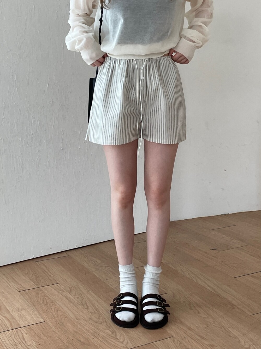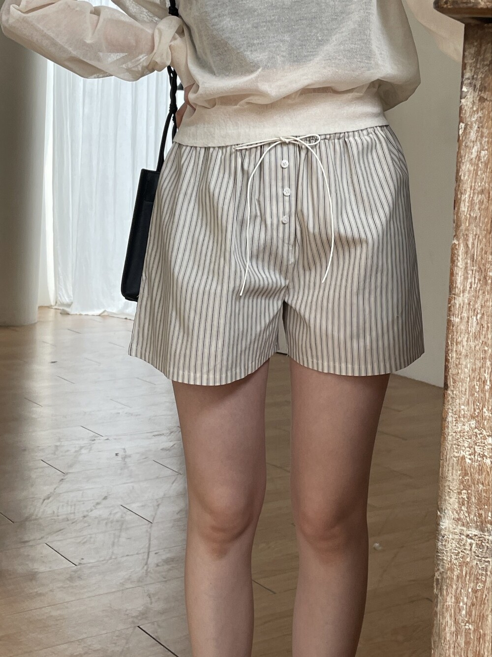 잔잔한 스트라이프 패턴과 버튼 디테일로 내추럴한 매력이 돋보이는 숏팬츠예요.