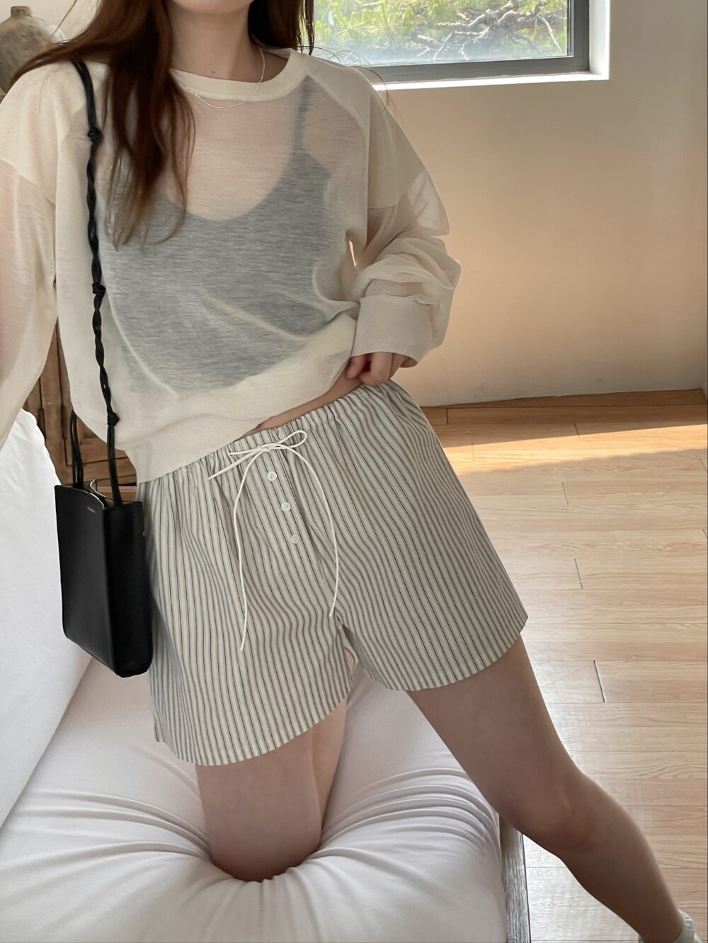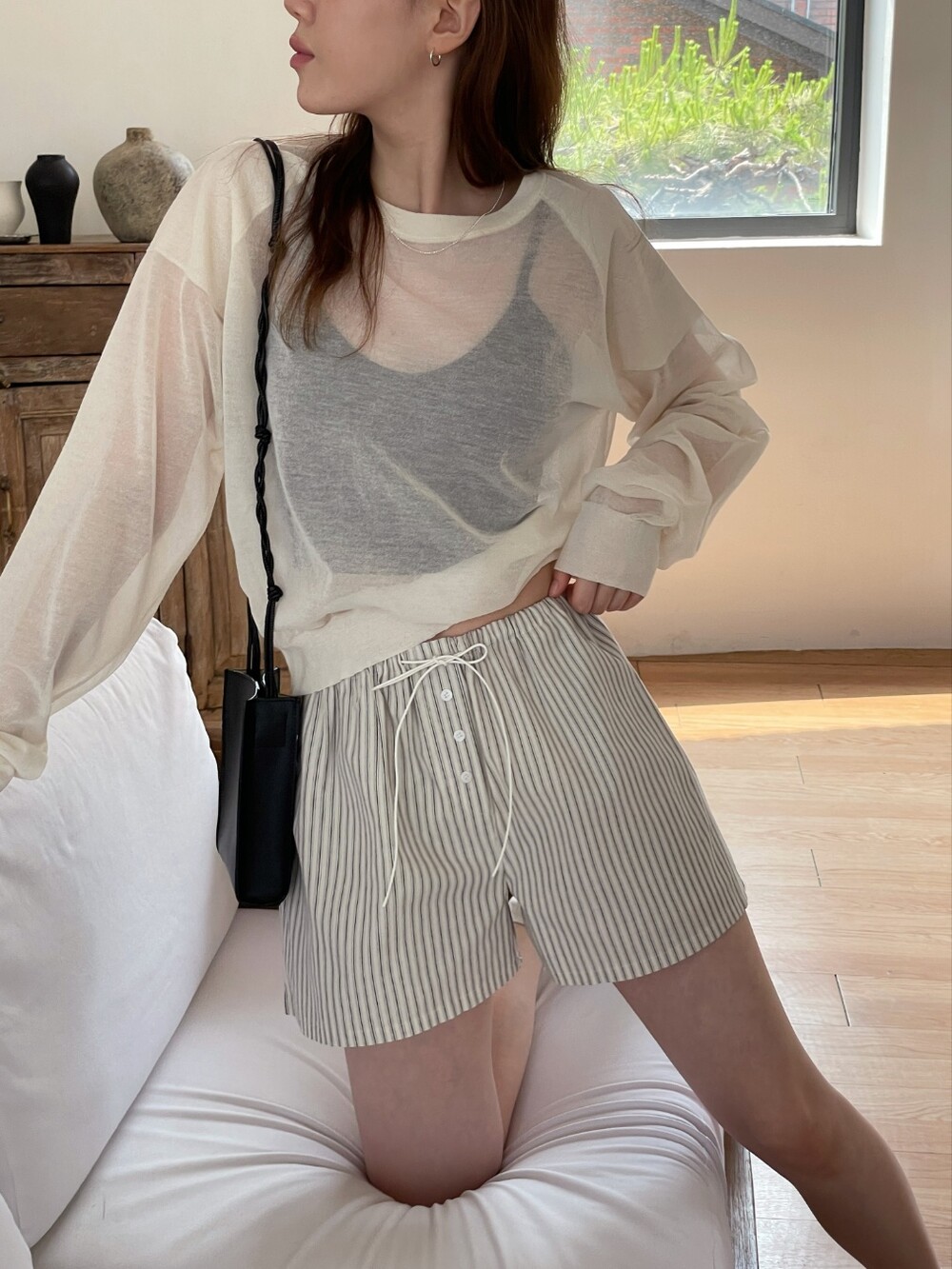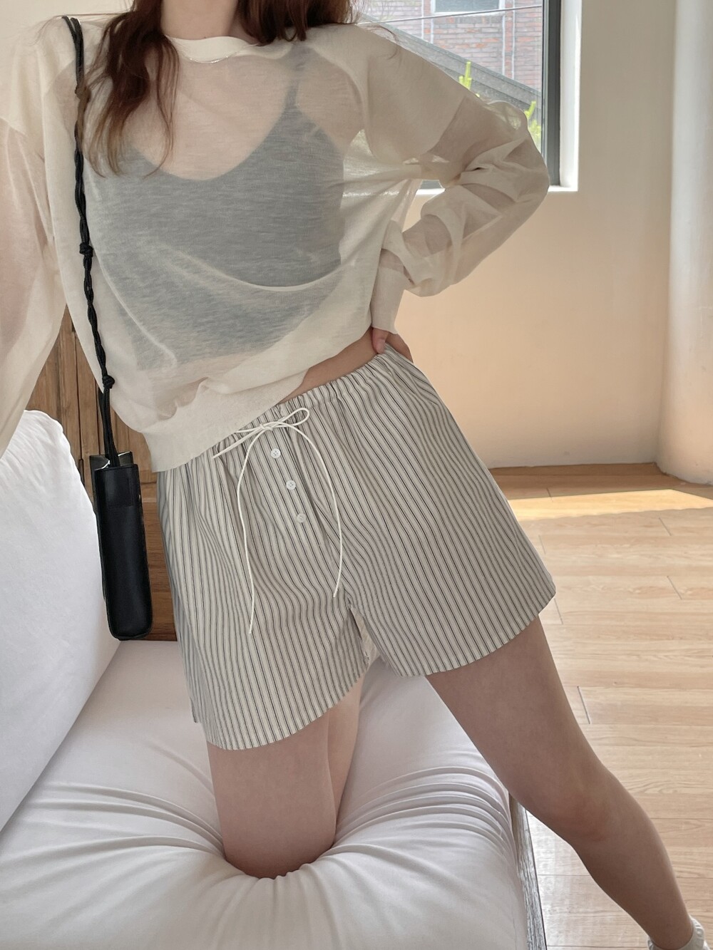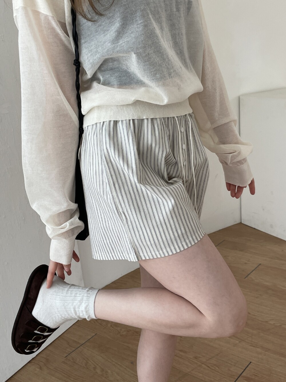 잔잔한 스트라이프 패턴과 버튼 디테일로 내추럴한 매력이 돋보이는 숏팬츠예요.