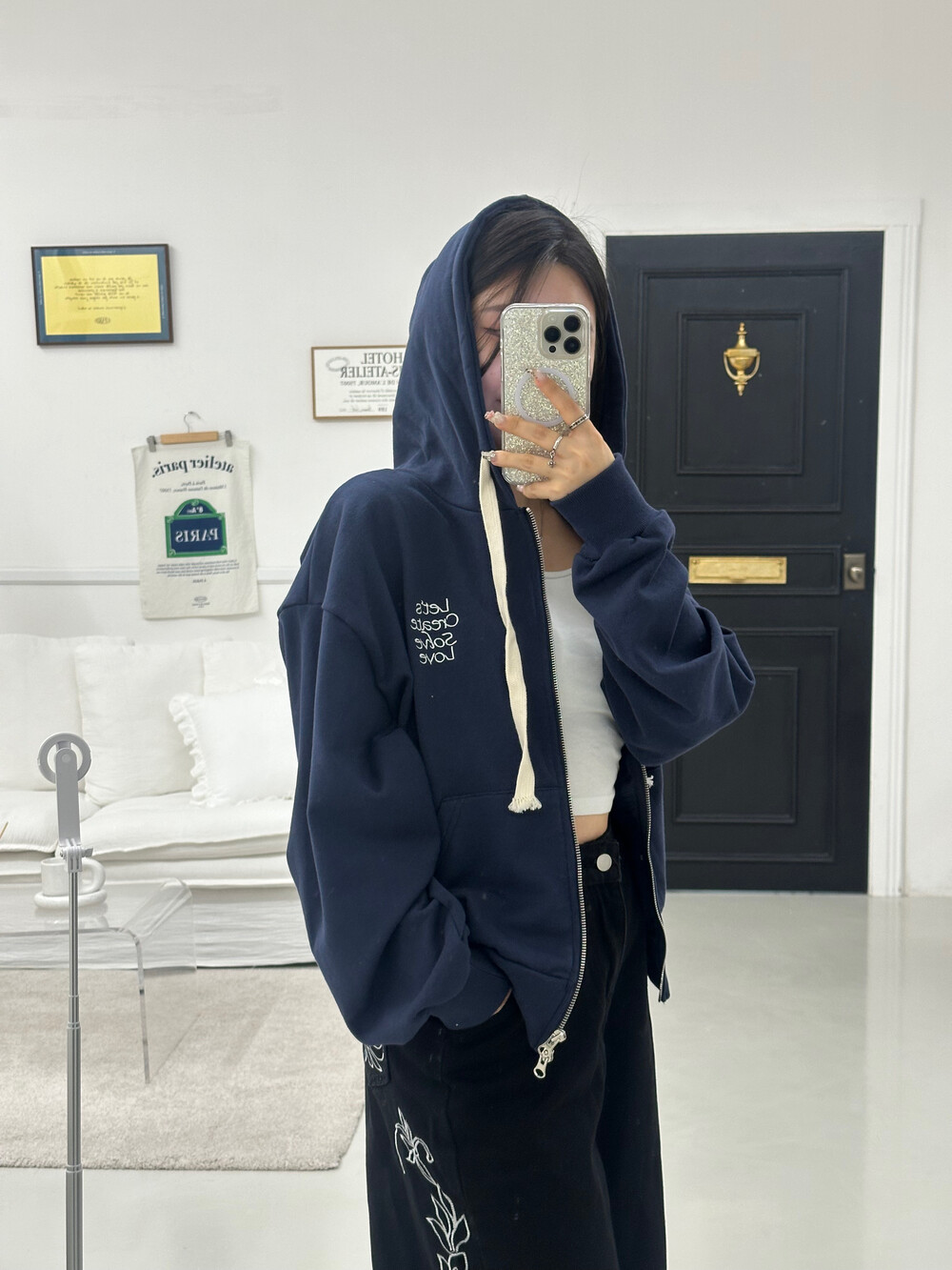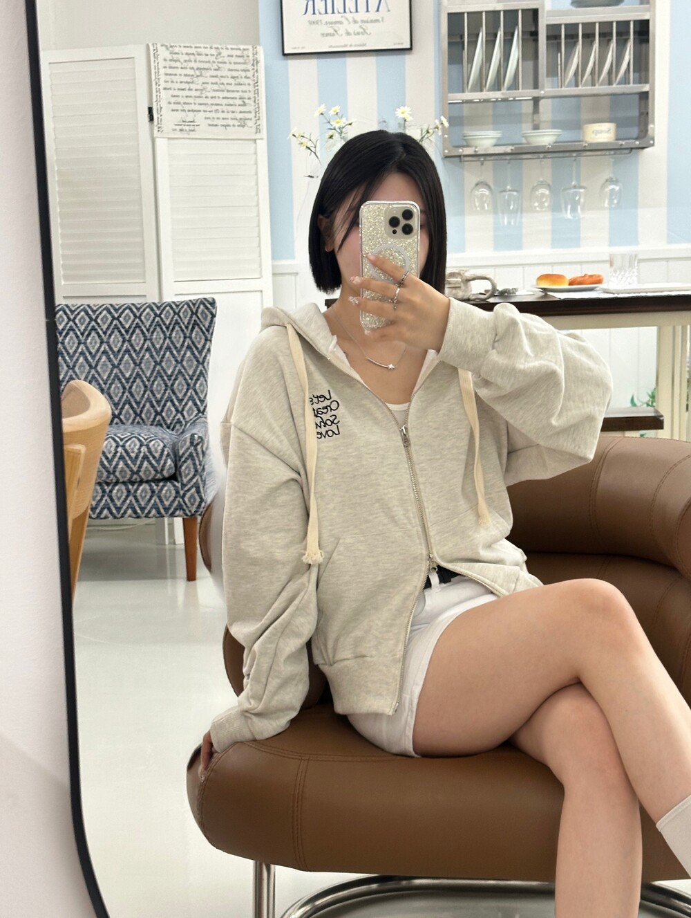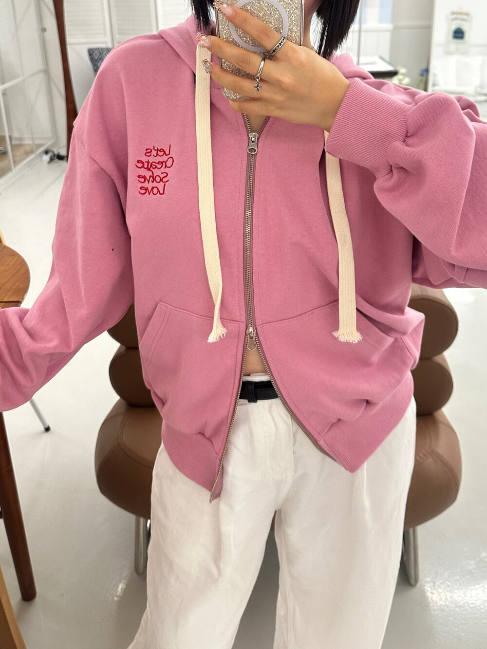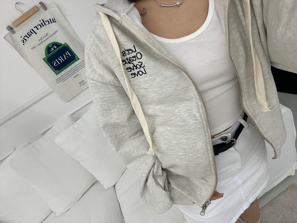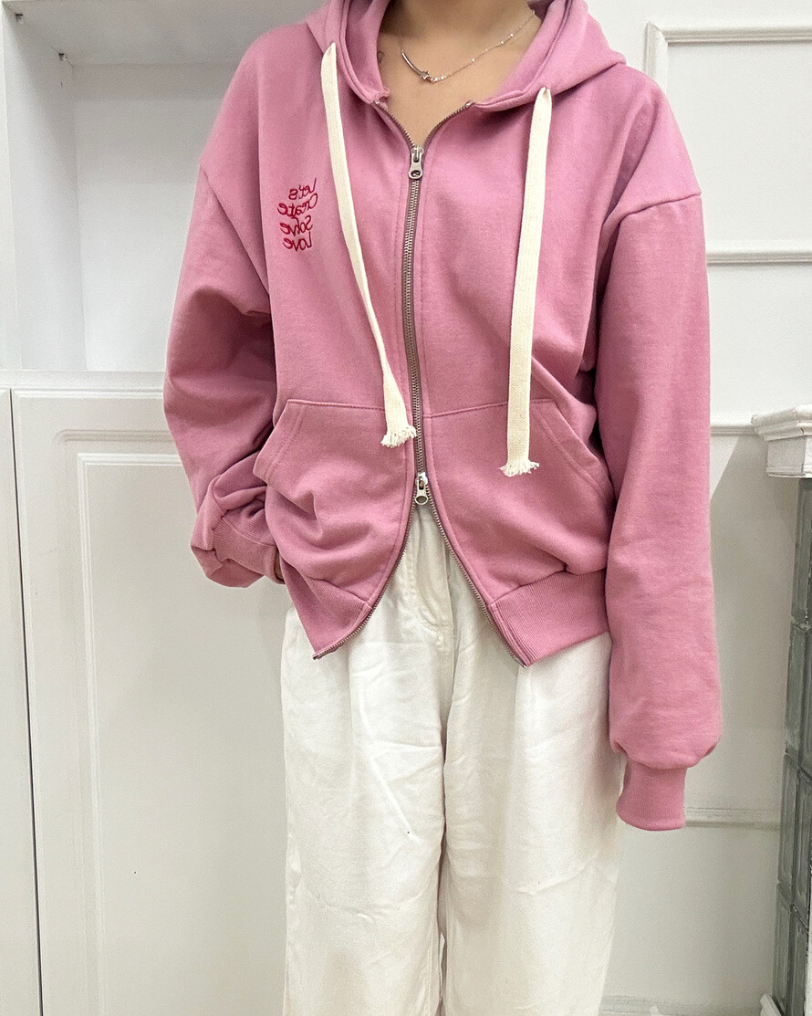 큰 모자와 레터링 포인트로 데일리한 후드집업에 러블리힙 무드를 더했어요