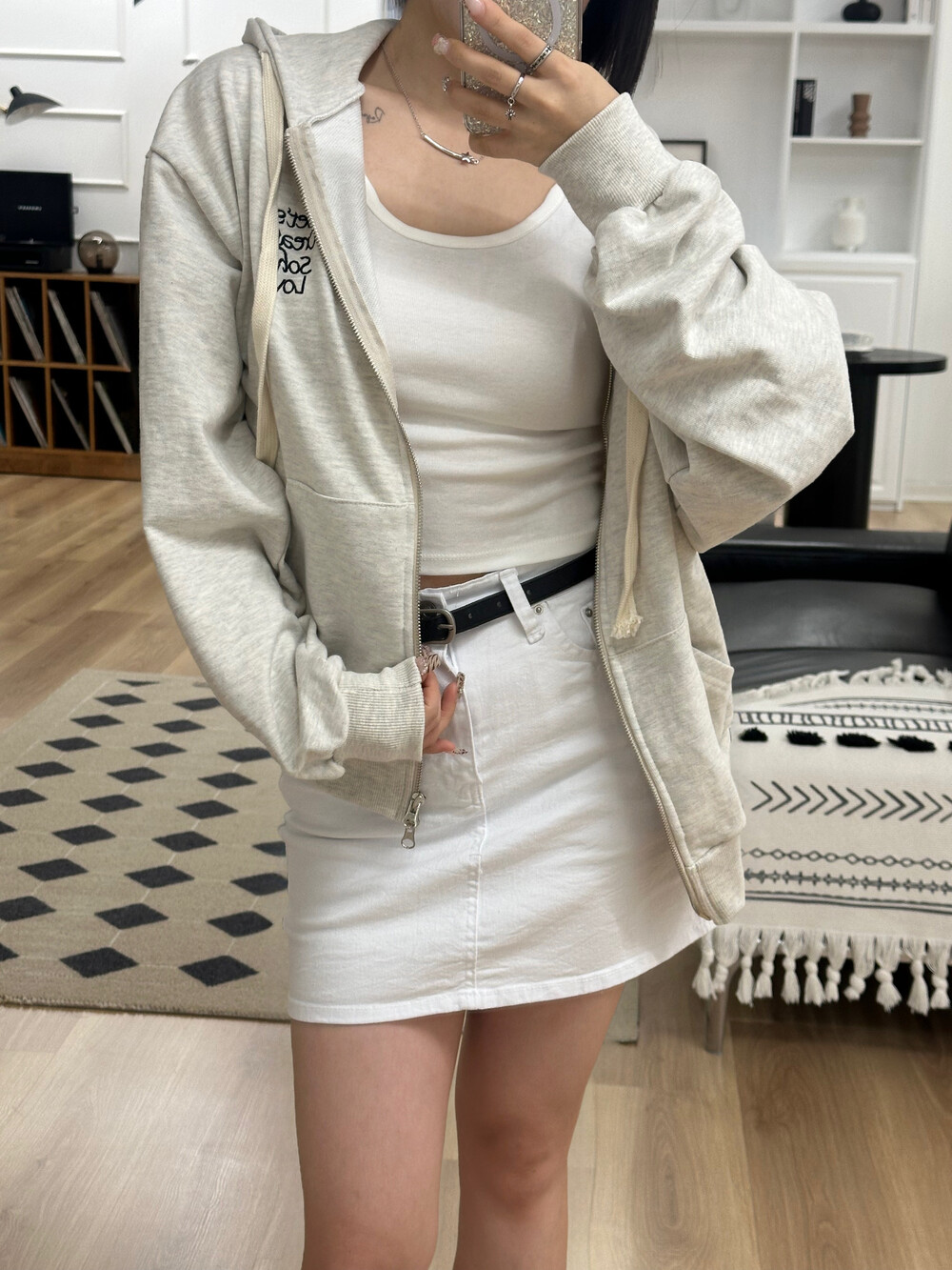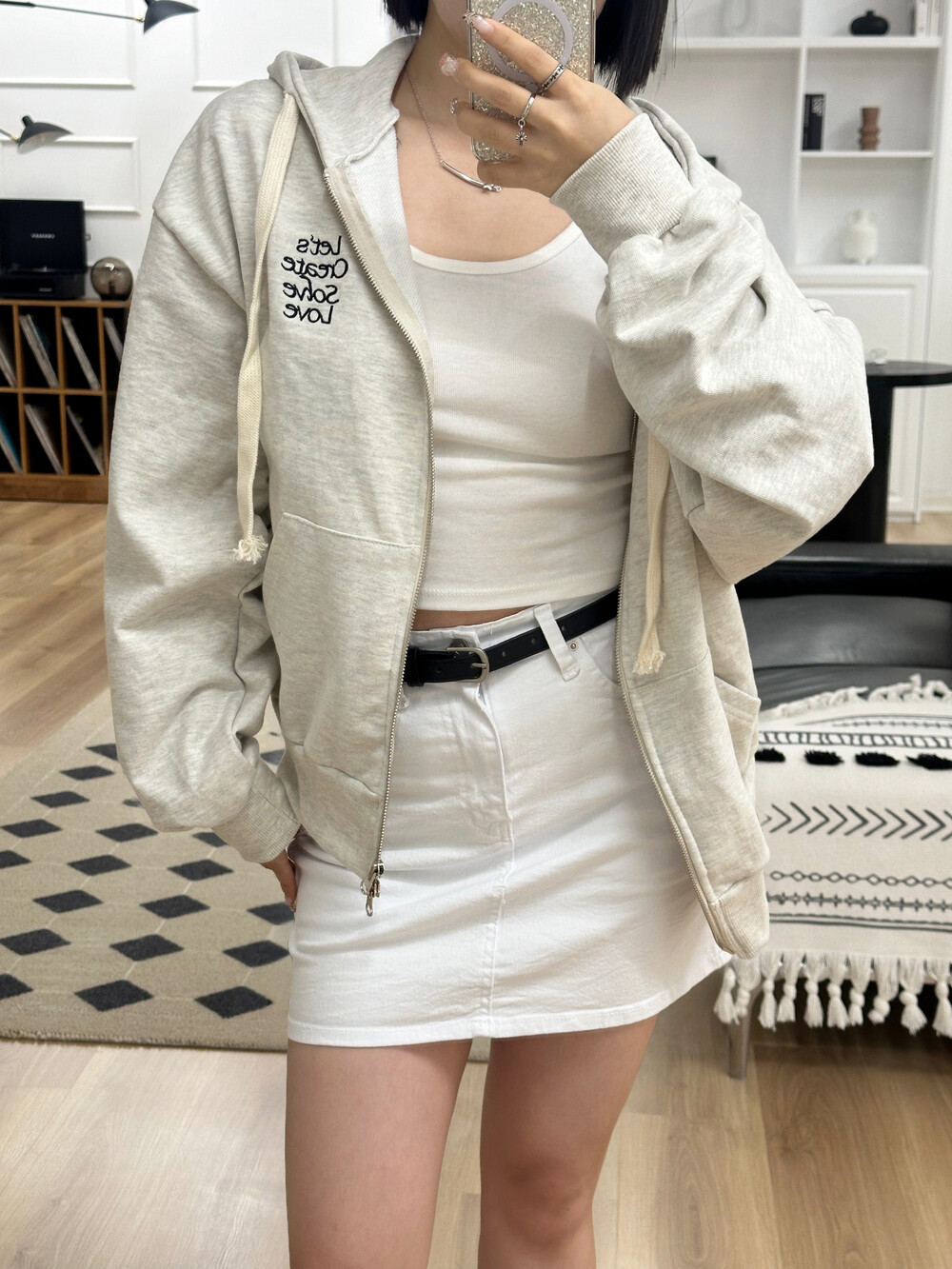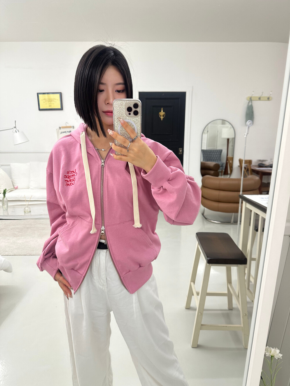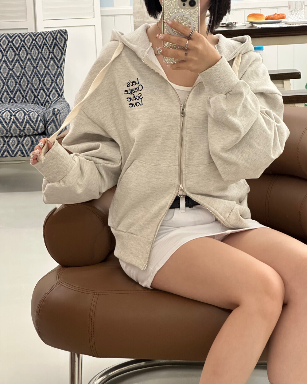 큰 모자와 레터링 포인트로 데일리한 후드집업에 러블리힙 무드를 더했어요