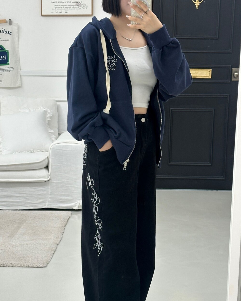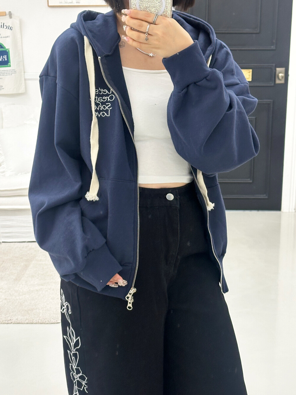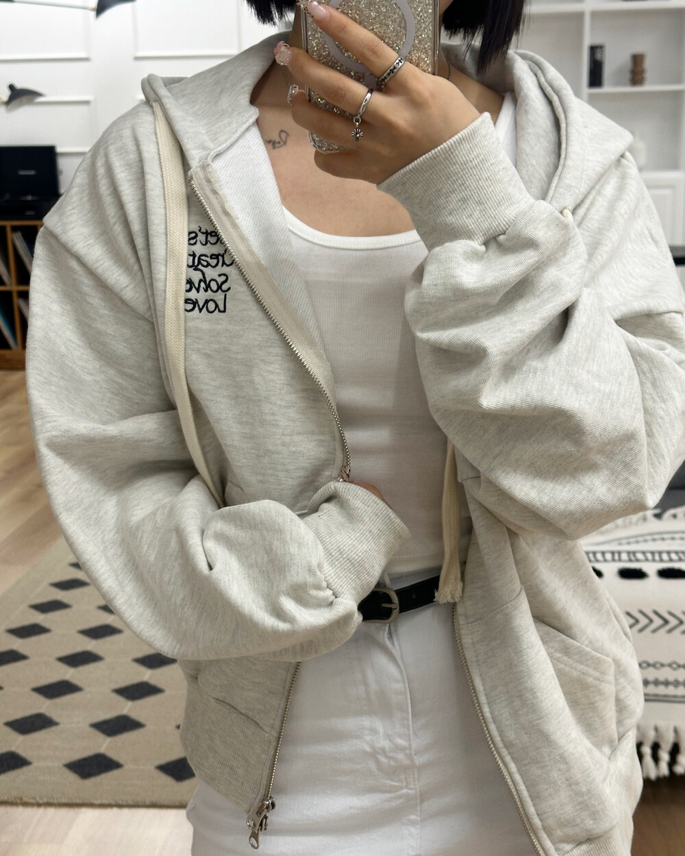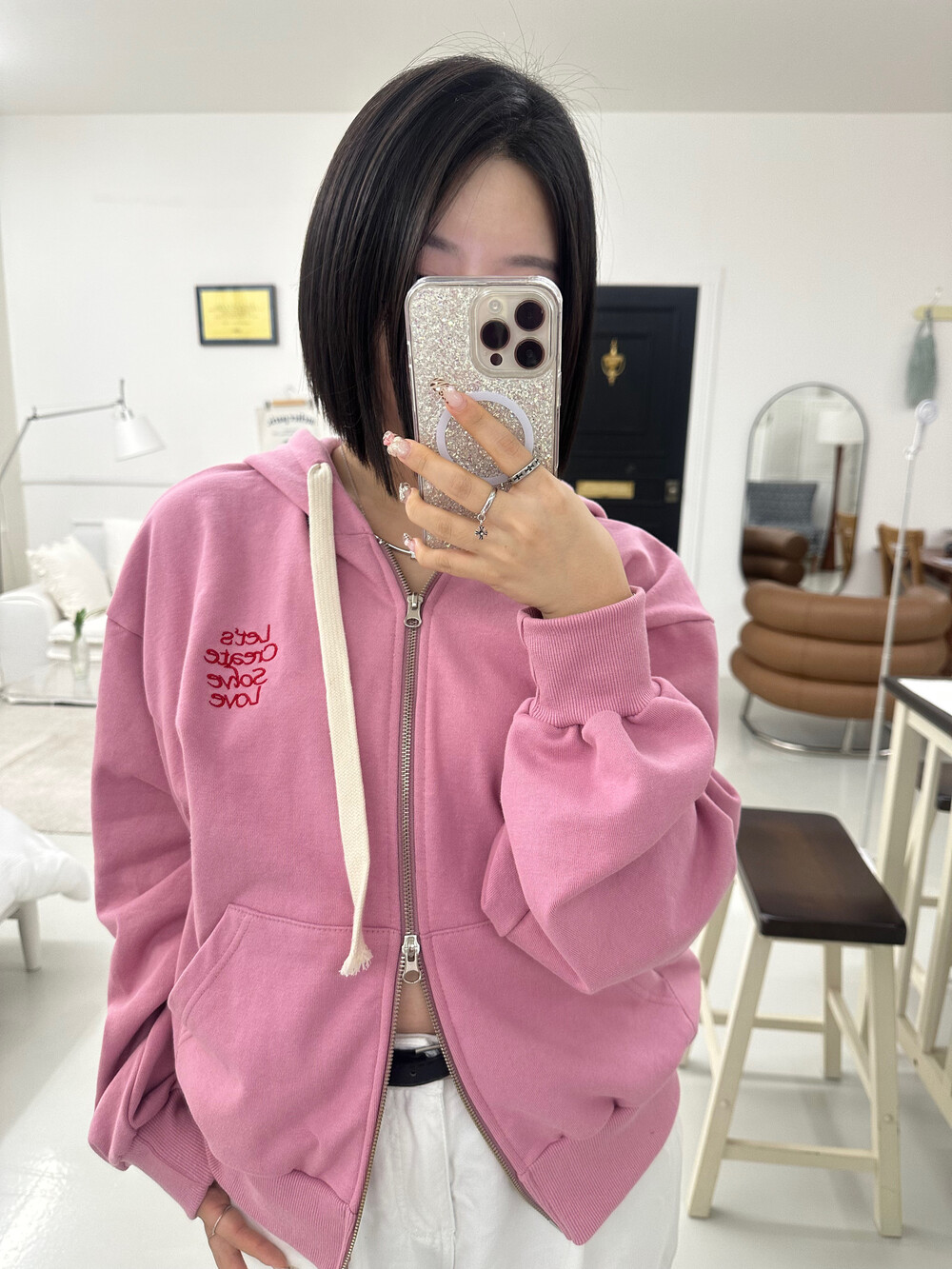 큰 모자와 레터링 포인트로 데일리한 후드집업에 러블리힙 무드를 더했어요
