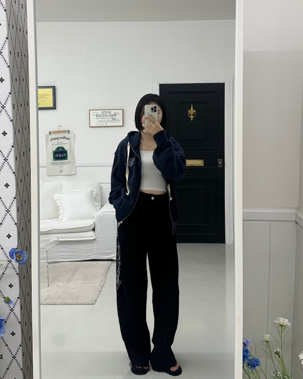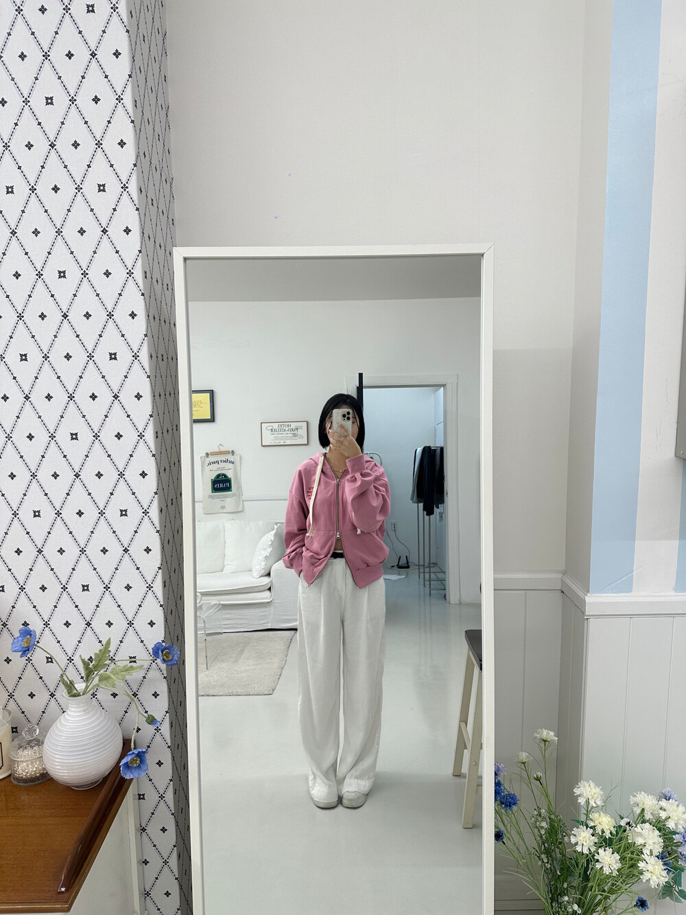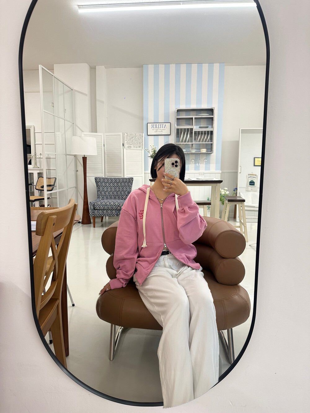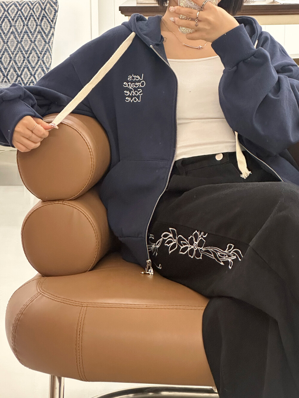 큰 모자와 레터링 포인트로 데일리한 후드집업에 러블리힙 무드를 더했어요