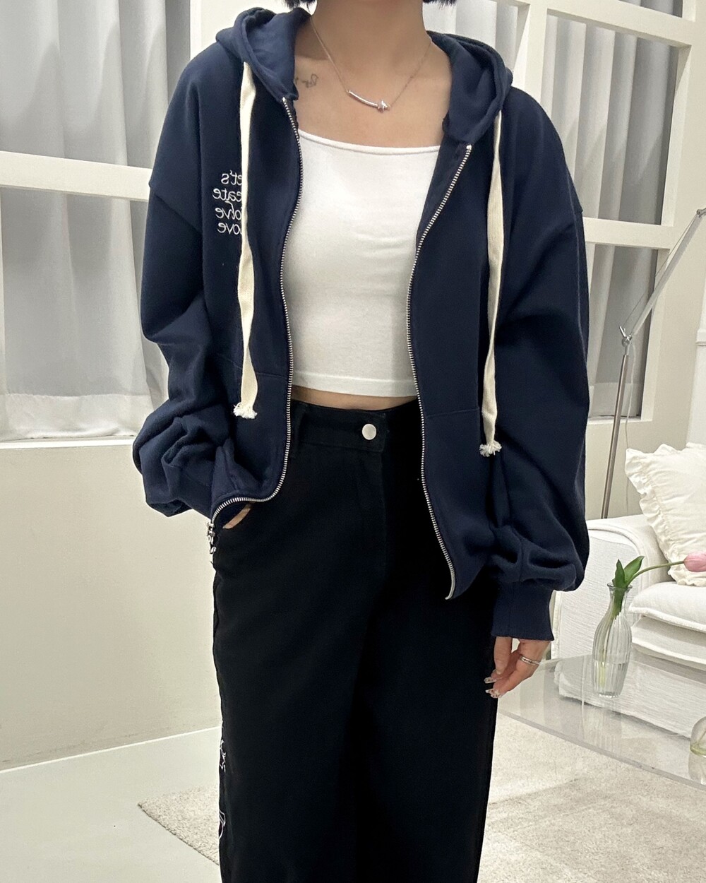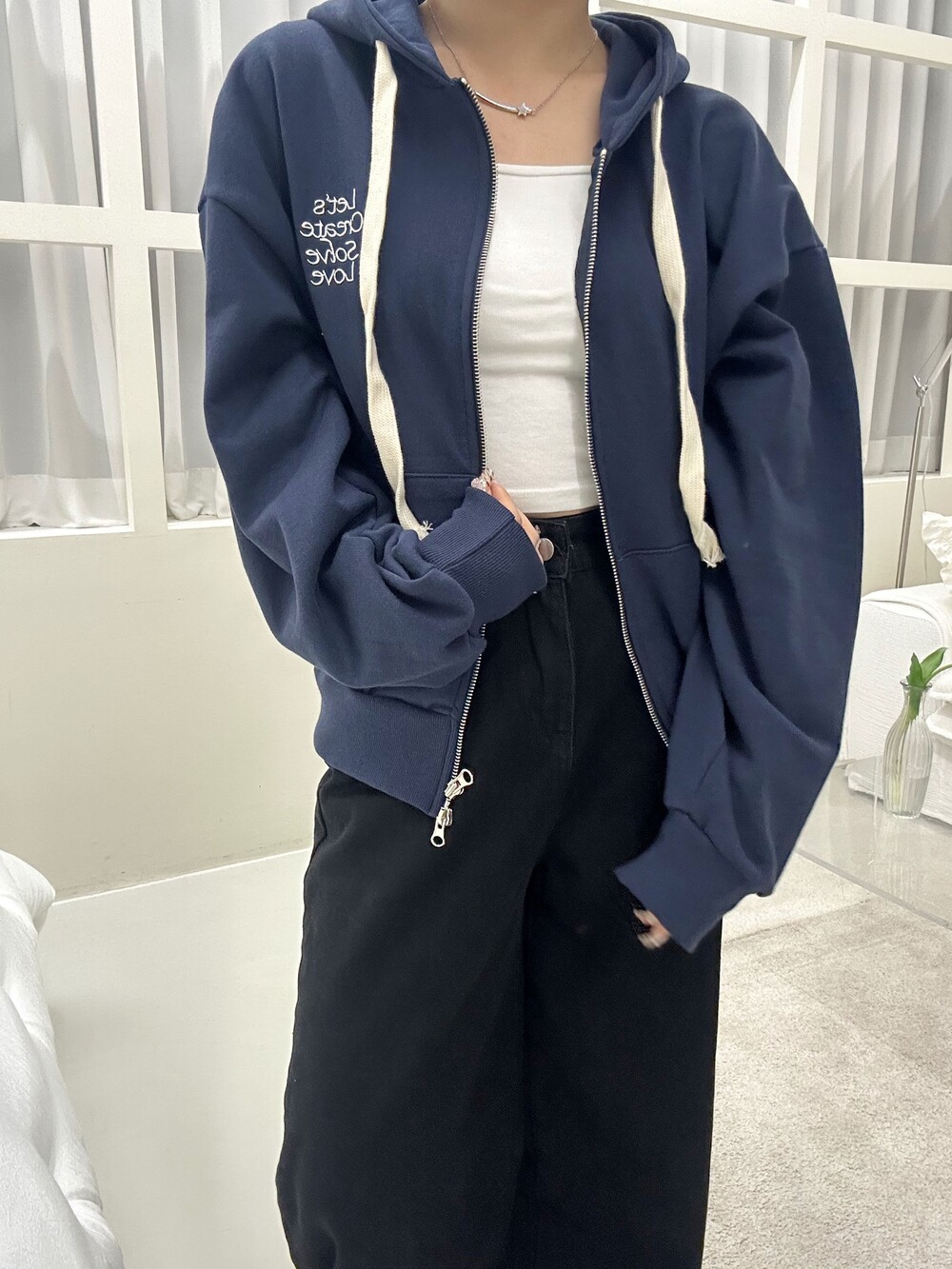 루즈한 핏으로 편안하게 착용할 수 있는 데일리 투웨이 후드집업이에요.
